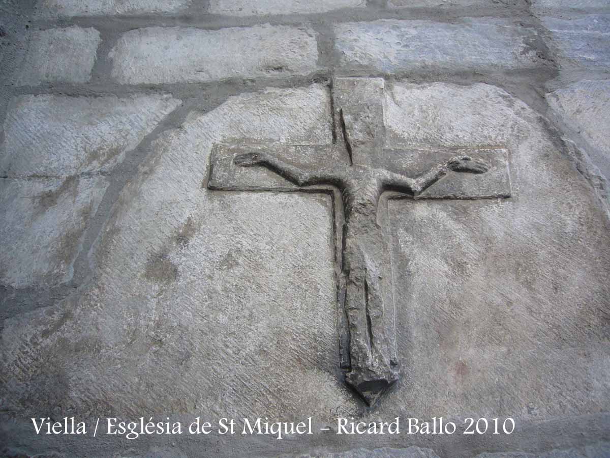 Situat a l'esquerra del pòrtic, hi ha un relleu en pedra de Crist a la Creu.