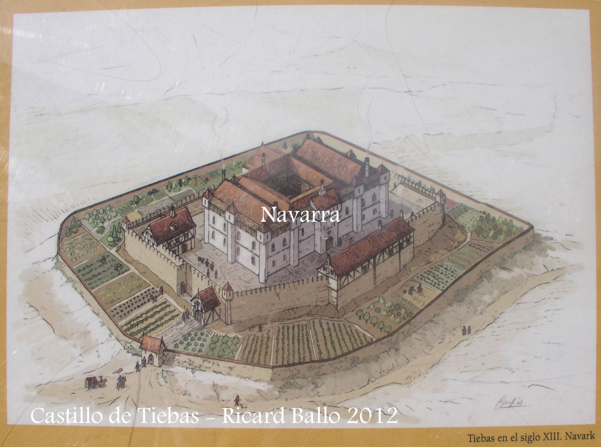 En la comarca de Pamplona, Tiebas conserva parte del castillo construido por Teobaldo II de Champaña (1253-1270) que fue residencia real, archivo de la cancillería y prisión. Fue incendiado por los castellanos en la guerra de 1378 y reparado por Juan de Beaumont, a quien se lo cedió Juan II en 1445. En 1494, fue tomado por el rey Juan de Labrit y en 1521 salieron de aquí parte de las huestes del francés Asparrós para ser derrotadas en la batalla de Noain. En 1564 pasó a la casa de Alba. Todavía en la Guerra de la Independencia, se instaló una guarnición francesa. Es de planta rectangular con patio de armas central, a cuyos lados se situaban las dos alas residenciales. Los muros, reforzados por contrafuertes, remataban en garitones con chapiteles emplomados. Se mantiene en pie buena parte de su estructura, bastante arruinada, un tramo de escalera, varios arranques de bóvedas con nervadura gótica y una cámara subterránea de piedra. En 1997 una excavación sacó a la luz algunos hallazgos arqueológicos interesantes.