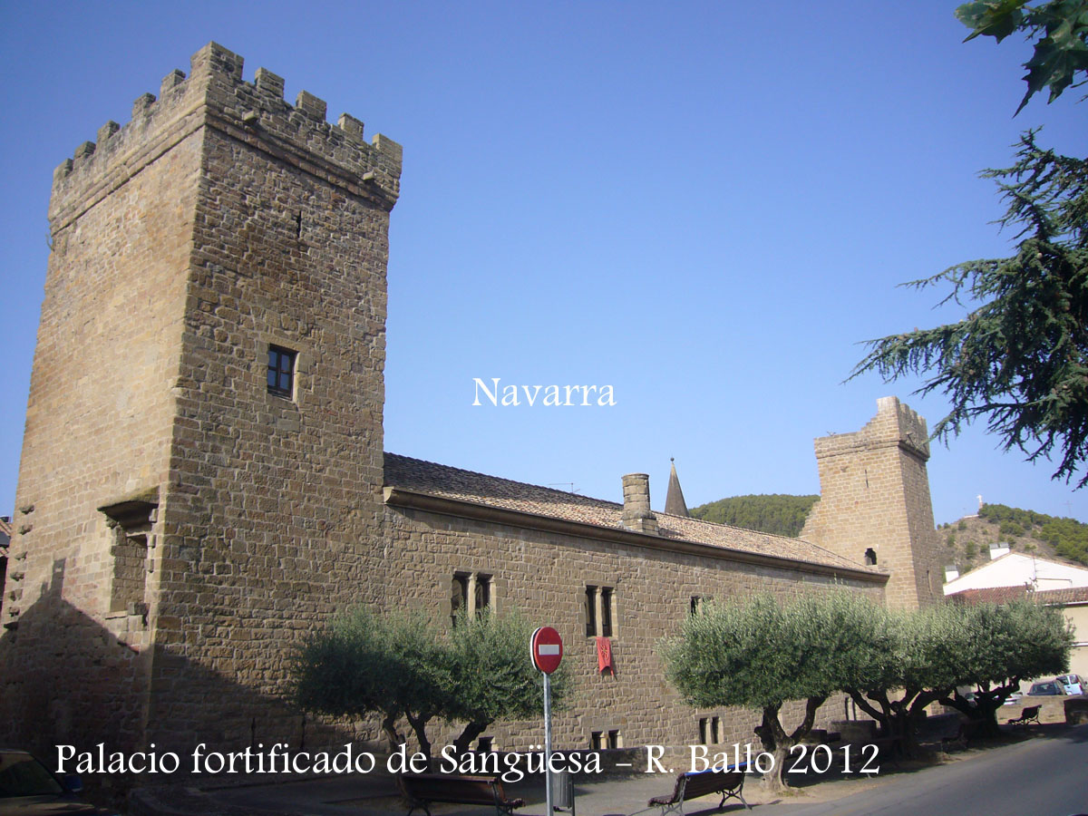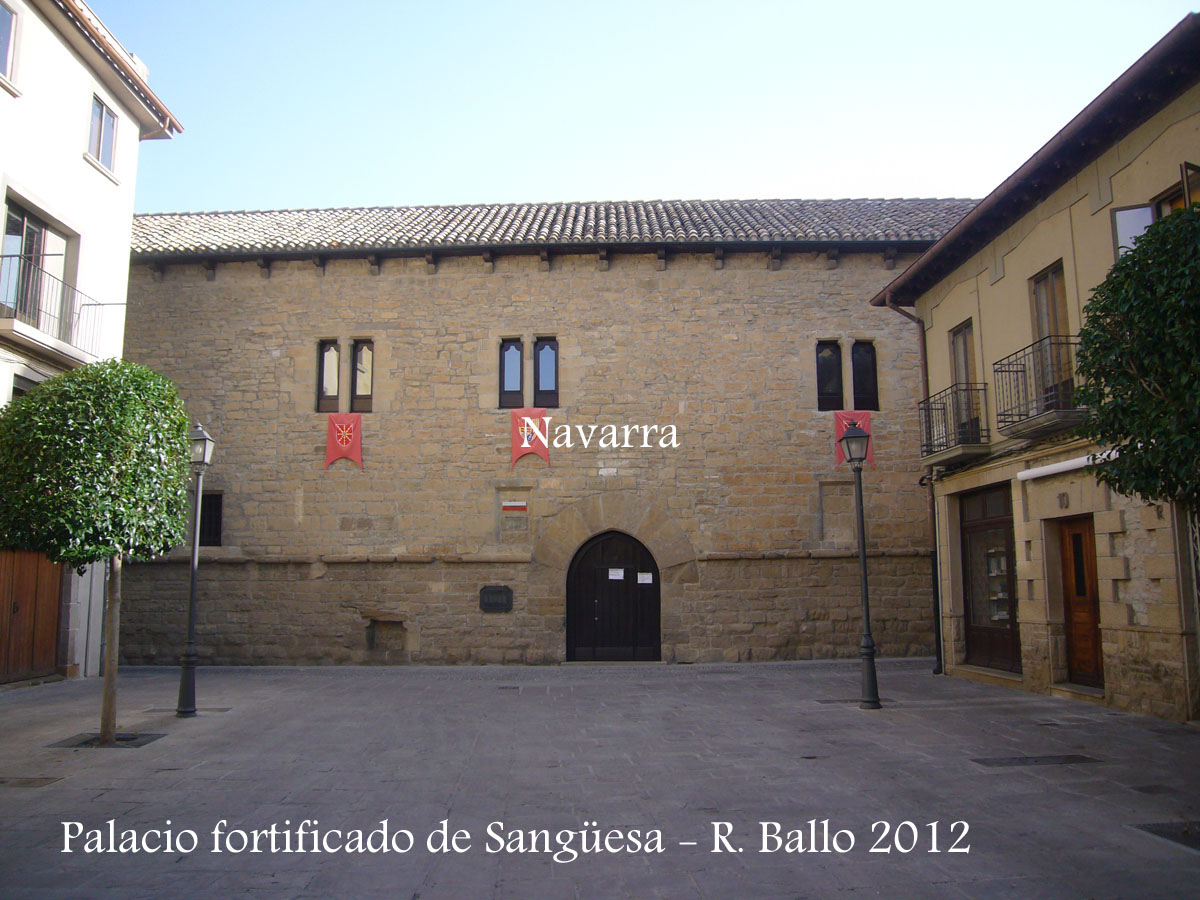 Del recinto amurallado medieval de Sangüesa quedan el portal de la Tajada y algunos restos. Hubo un castillo, llamado el Castellón, en lo alto del cerro, que fue derribado en 1519. Del palacio de los reyes de Navarra, que era de planta rectangular y llegaba hasta la calle Mayor, queda la fachada posterior, flanqueada por dos torres almenadas, que formaban parte del recinto de la villa y se reformaron en 1360 y a finales del siglo XV. Tras la conquista de Navarra el palacio fue cuartel de la guarnición castellana y quedó muy dañado. El ayuntamiento lo compró en 1535 y más tarde, en 1570, demolió una de sus alas para edificar la casa consistorial con su pórtico renacentista. La parte posterior con sus dos torres fue adquirida por la Diputación Foral en 1949 y restaurada posteriormente. En 1965 una excavación recuperó el antiguo foso y el talud de la base del muro.