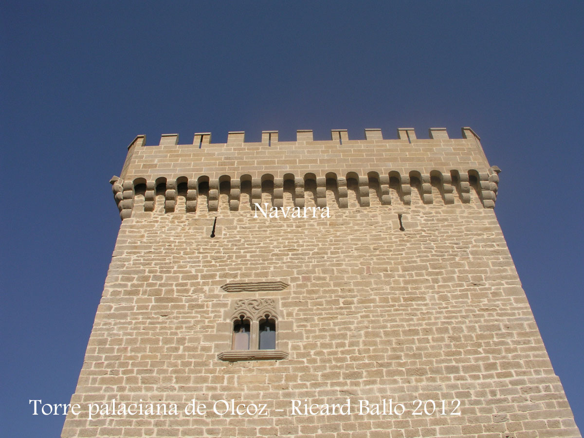 La torre fortificada de Olcoz fue erigida hacia 1300 por el linaje de Olcoz y en el siglo XVI pasó a los Ozta. Fue palacio cabo de armería y su dueño era llamado a las Cortes de Navarra. El paramento de los muros acusa dos épocas distintas. La puerta de acceso, de arco ojival, data del siglo XV y a la altura del primer piso existe otra, de arco de medio punto, que debió de ser la primitiva.