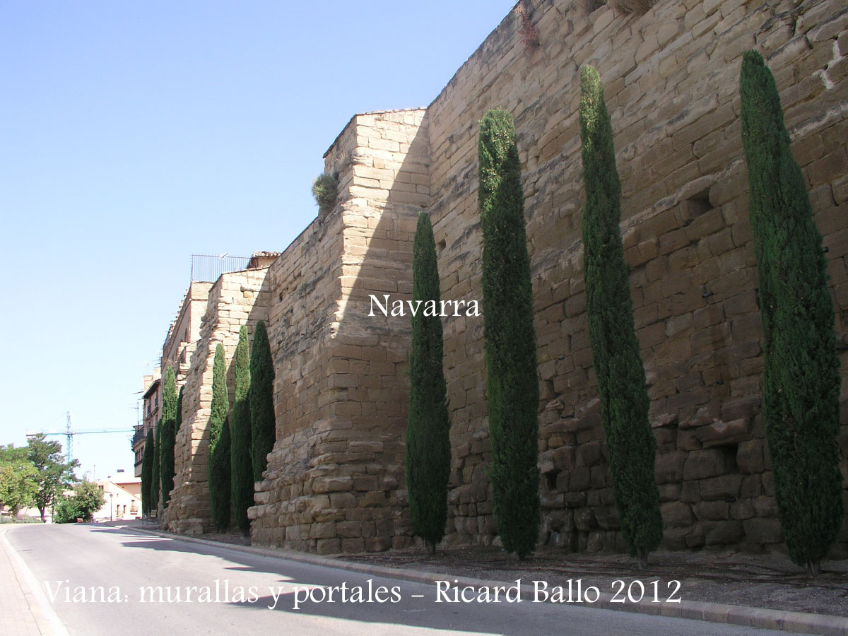 La localidad de Viana fue fundada por el rey Sancho el Fuerte, que le dio su fuero en 1219, con el fin de defender la frontera con Castilla. Estuvo rodeada de un recinto con (?) torres, en el que el castillo y las iglesias de San Pedro y Santa María constituían los principales puntos defensivos. Por su posición fronteriza, Viana sufrió asedios en 1275, 1378 y 1460, y obtuvo varios privilegios por el valor con que resistió a los castellanos. El célebre César Borgia fue muerto cerca de aquí en 1507 y enterrado en la iglesia de Santa María. Tras la conquista de Navarra, las murallas fueron compradas por el ayuntamiento en 1570 y se empezó a construir casas adosadas a ellas. El castillo se salvó de la demolición y se mantuvo en pie, aunque muy deteriorado, hasta 1940. En la actualidad se conserva la mutilada torre de San Pedro, con una barbacana reforzada por contrafuertes. Y los portales de la Solana, de Estella, de Santa María y de San Felices, además de los de San Miguel y de la Trinidad, que son posteriores. Los de Estella y de la Solana, reedificados en 1563 y 1583, ostentan escudos con las armas reales españolas de tiempo de la Casa de Austria.