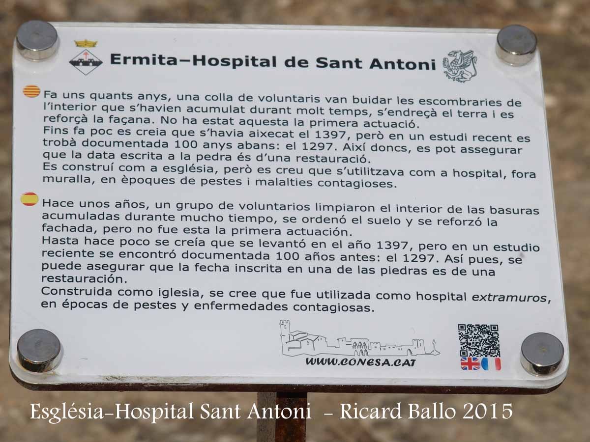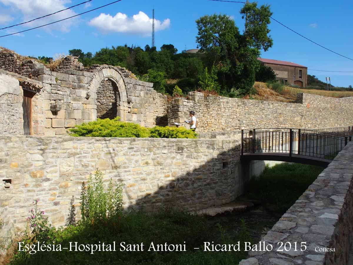 Està situada al davant mateix del Portal de Sant Antoni. A la vegada aquest portal està situat al davant de la Font Vella.(Es poden veure imatges d'aquestes edificacions a la nostra pàgina de l’església parroquial de Santa Maria de Conesa.