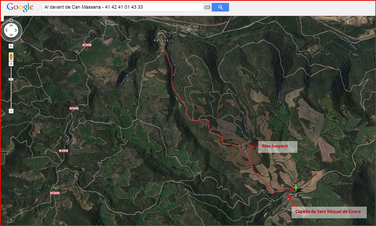 Al cap d'uns 2,8 km aproximadament, arribem a Can Massana i aparquem al davant, al voral de la carretera (41 42 41 01 43 33), continuant uns metres a peu fins arribar a la capella.
