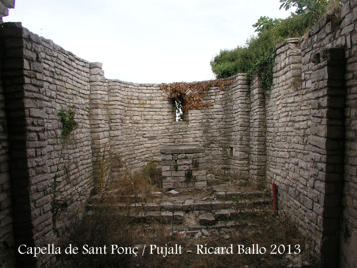 “ La capella de Sant Ponç -nucli de Pujalt- situada dins del nucli urbà, arran del castell, d'estil romànic primerenc, es troba en fase de recuperació.”