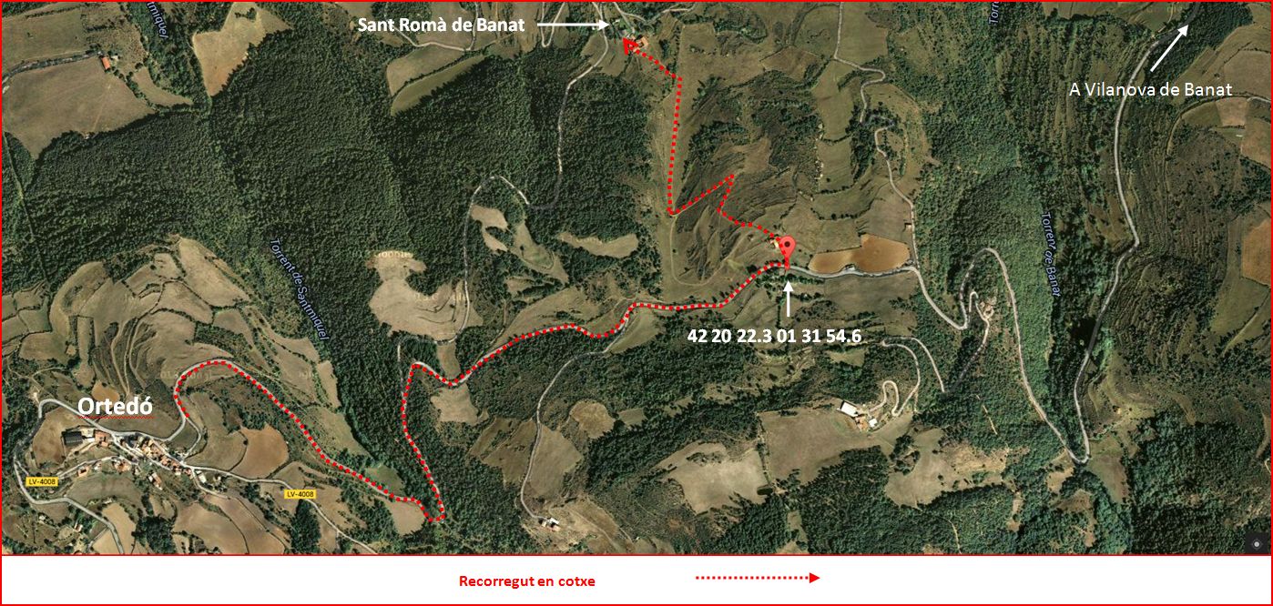 Remarca: La darrera part de l'itinerari detallada al mapa (Des de la icona de color vermell), no la tenim ben clara. No recordem si d'acord amb aquest mapa vàrem anar per dalt, o per baix. En qualsevol cas, sobre el terreny, no hi ha cap dificultat per interpretar el camí en aquesta part final del recorregut.
