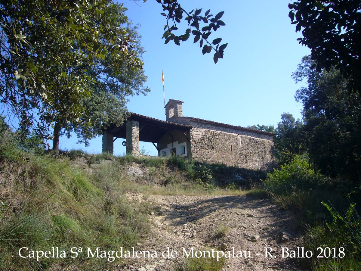 Des d’aquí continuarem a peu l’itinerari. Davant per davant per on hem entrat, s’inicia una ampla pista de muntanya, sense cap indicació, per on seguirem, i que aviat es transforma en una forta pujada. En 10 minuts serem dalt de tot, on hi ha les restes del Castell de Montpalau i de la Capella de Santa Magdalena, l'església del castell.