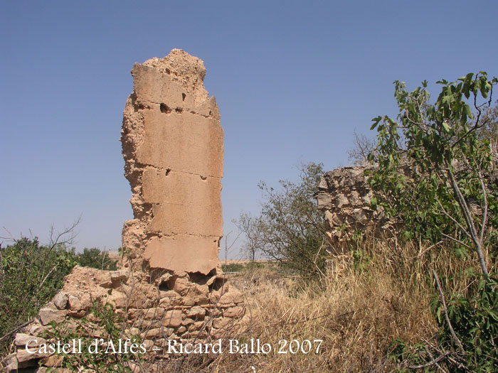 “ Segle XII. Situat damunt d'un tossal, aquest castell està format per un conjunt de restes d'una fortalesa d’origen islàmic, situades a l'extrem est del tossal de Vinfaro, davant del poble d'Alfés.