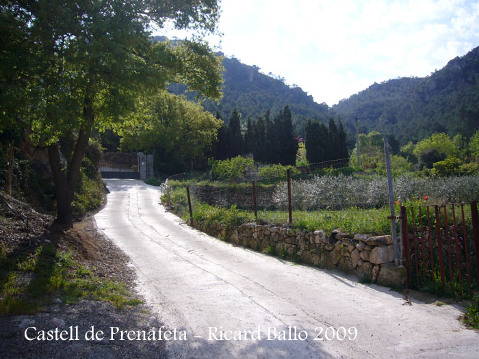 En una cruïlla de camins, profusament identificats, caldrà continuar cap a l’esquerra i amunt, assenyalat per un discret cartell, petit, de fusta: castell de Prenafeta.