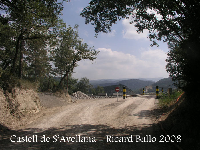 El camí puja suament, i el castell aviat serà visible, dalt d’un turó, a l’esquerra. Quan arribem a un pla, trobem unes instal·lacions d’extracció d’àrids. Una gran bàscula presideix a la dreta de la carretera.