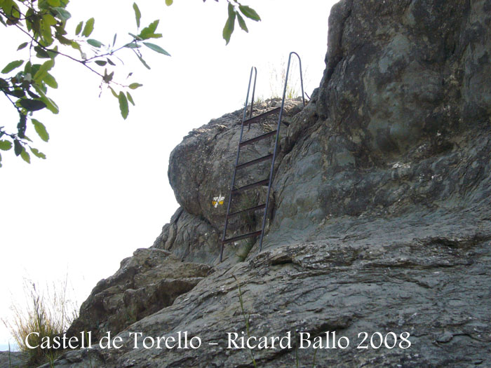 Uns metres abans, a la dreta ja es veu l’inici d’un petit corriol. Cal agafar-lo en direcció a l’esquerra i amunt, de manera intuïtiva i a la vegada expeditiva. Al cap de molt poc, ens sorprendrà la visió d’una petita escala de ferro, de sis graons, fixada a la paret,