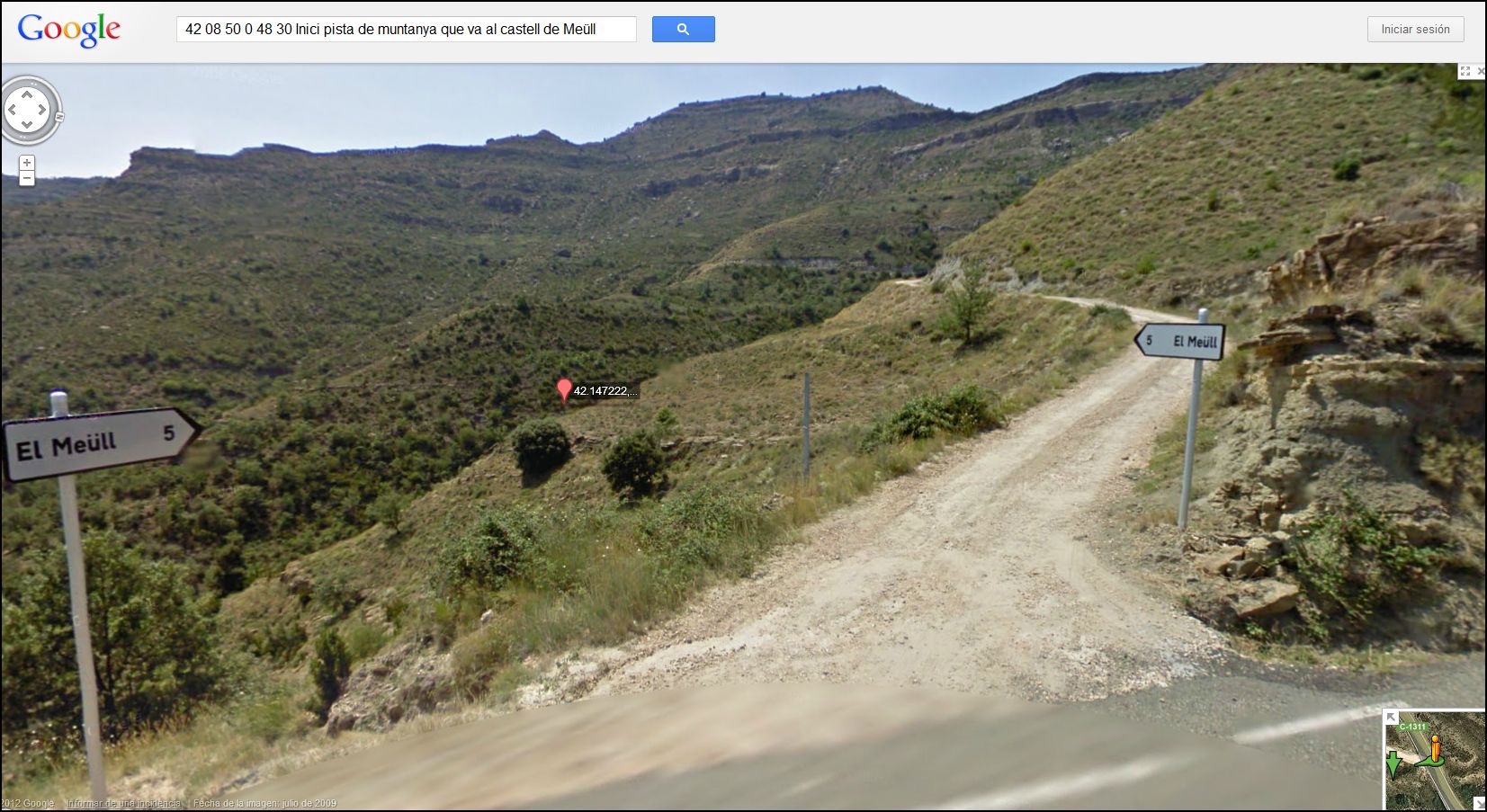 2 - Al PK 15 d'aquest vial trobarem un trencall a l'esquerra (42 08 50 0 48 30) on hi ha una indicació: El Meüll – 5 km. Aquí s'inicia una pista de muntanya, identificada a Google Maps com a camí de Mur, per on continuarem.