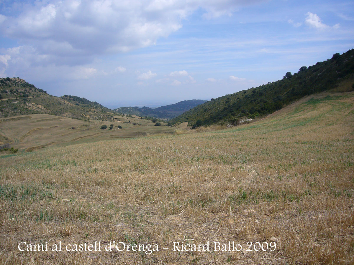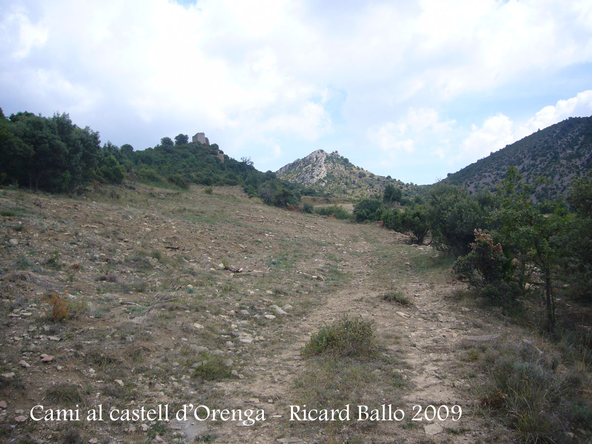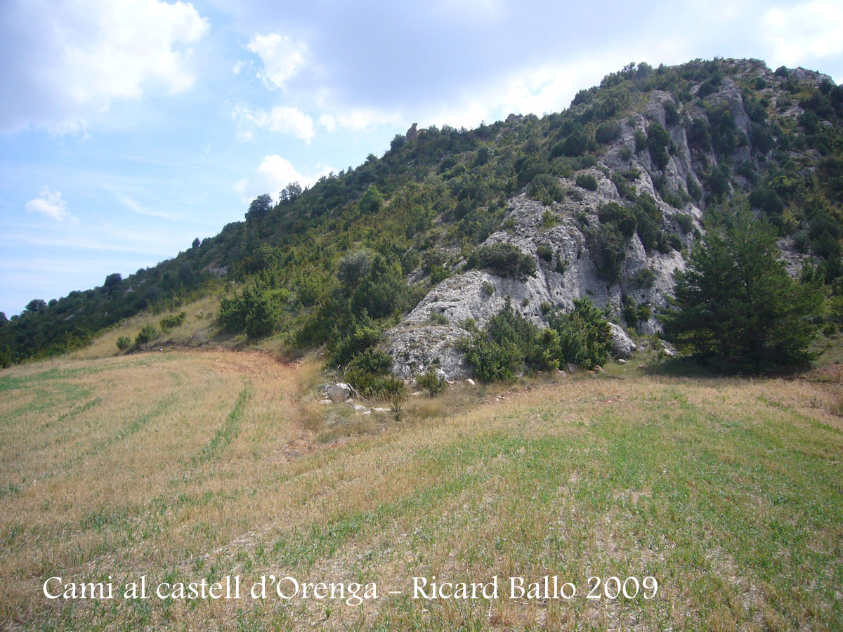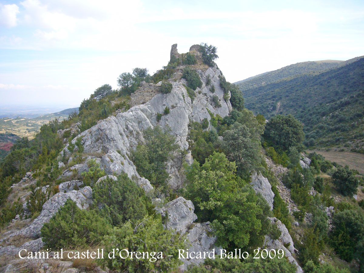Davant nostre, a la dreta s’aixeca imponent una penya rocallosa. Dalt d’aquest cim hi trobarem el castell d’Orenga.