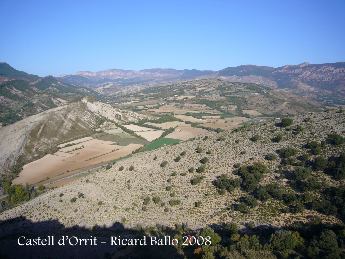 " El castell d'Orrit es troba situat a la riba catalana del riu Noguera Ribagorçana, que entre el Pont de Suert i Alfarràs fa de frontera entre Catalunya i Aragó.