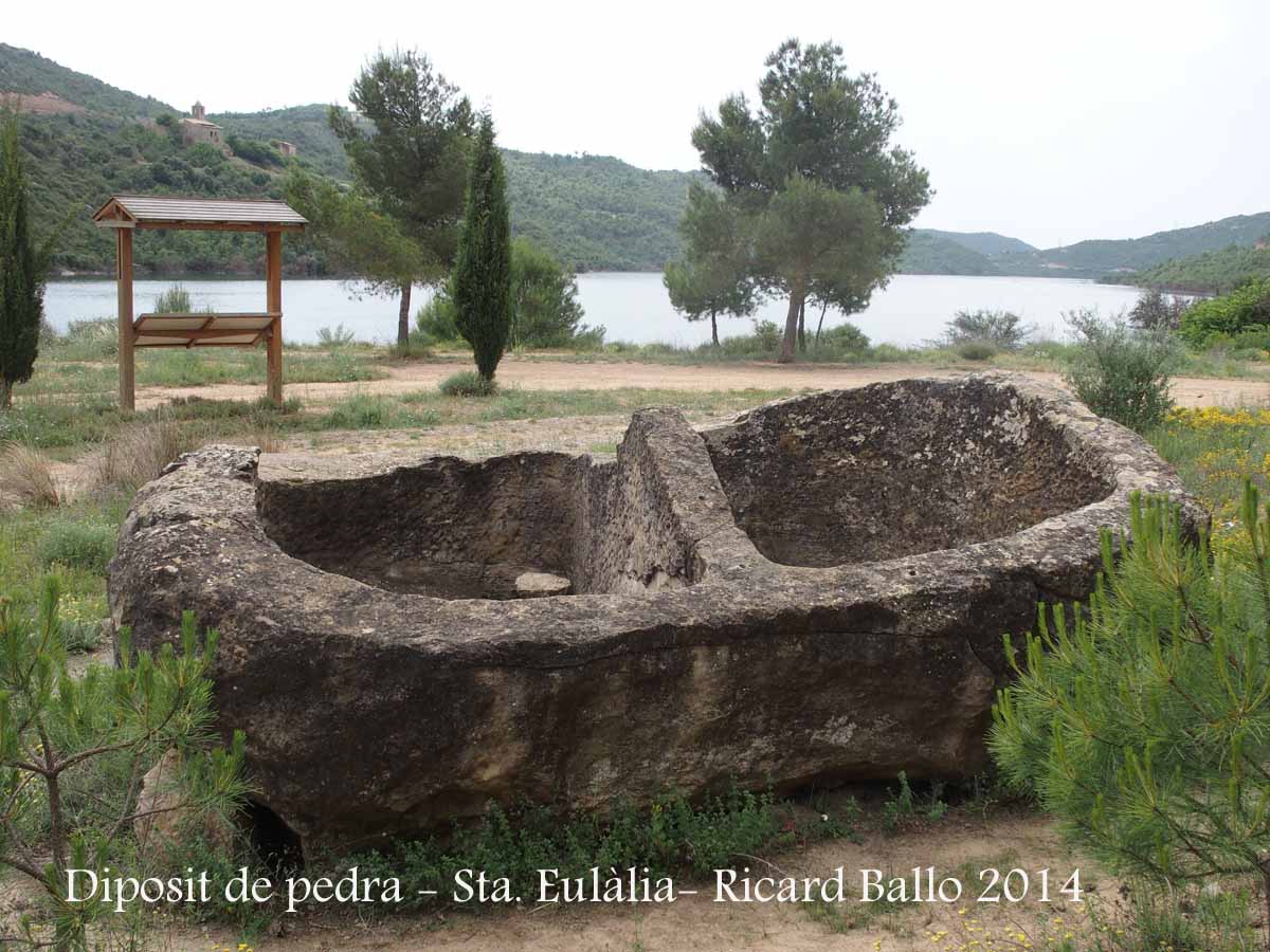 Al costat hi ha un imponent dipòsit de pedra de dos cossos. De moment, no hem trobat informació enlloc sobre aquesta peça. Una vegada hem descartat la possibilitat de que s'hagués pogut utilitzar per fer all i oli, mirarem d'obtenir informació al respecte.