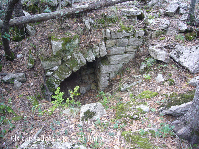 El recorregut segueix pel voral d’aquest conreu. Al cap de ben poc hi ha un trencall a mà esquerra, (41 29 01.00 01 33 27.00) per on continuem, travessant una petita riera que a dia d’avui porta molt poca aigua, i seguim camí amunt. Al cap de ben pocs metres tornem a trobar una petita desviació (41 29 0.68 01 33 33.04. El camí principal encara continua amunt) que ens aboca ara a una extensa clariana erma, on en un costat ja veiem l’edificació que busquem.