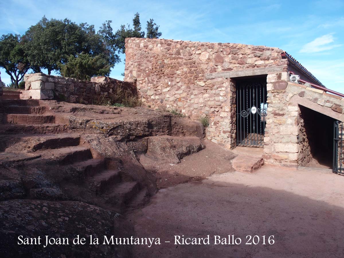 El mirador és una roca de saldó, vermella, que a la vegada fa de paret i sostre de l'ermita.