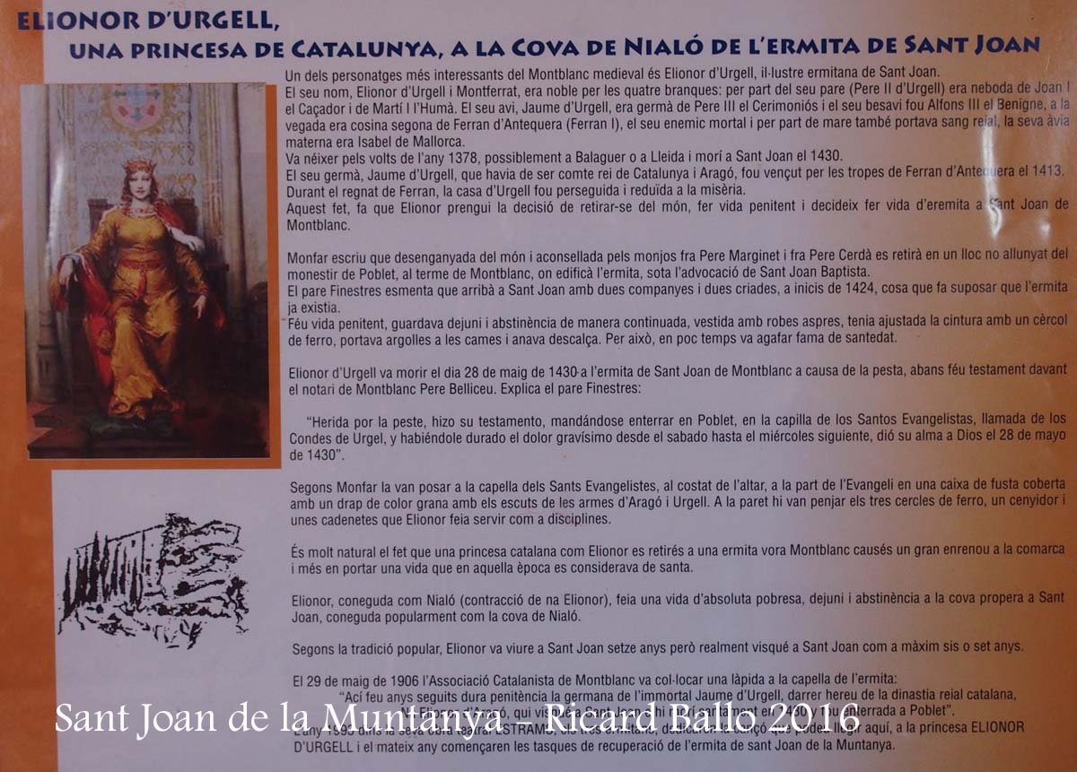 En qualsevol cas, sembla cert que Na Elionor, filla de Dom Pere, Comte d'Urgell, hi va fer penitència ben a prop d'allà, a la Cova de Nialó (nom que prové de la corrupció de Na Elionor), durant setze anys, fins que morí, víctima de la pesta, el 28 de maig del 1430, als 52 anys d'edat sent enterrada a Poblet.