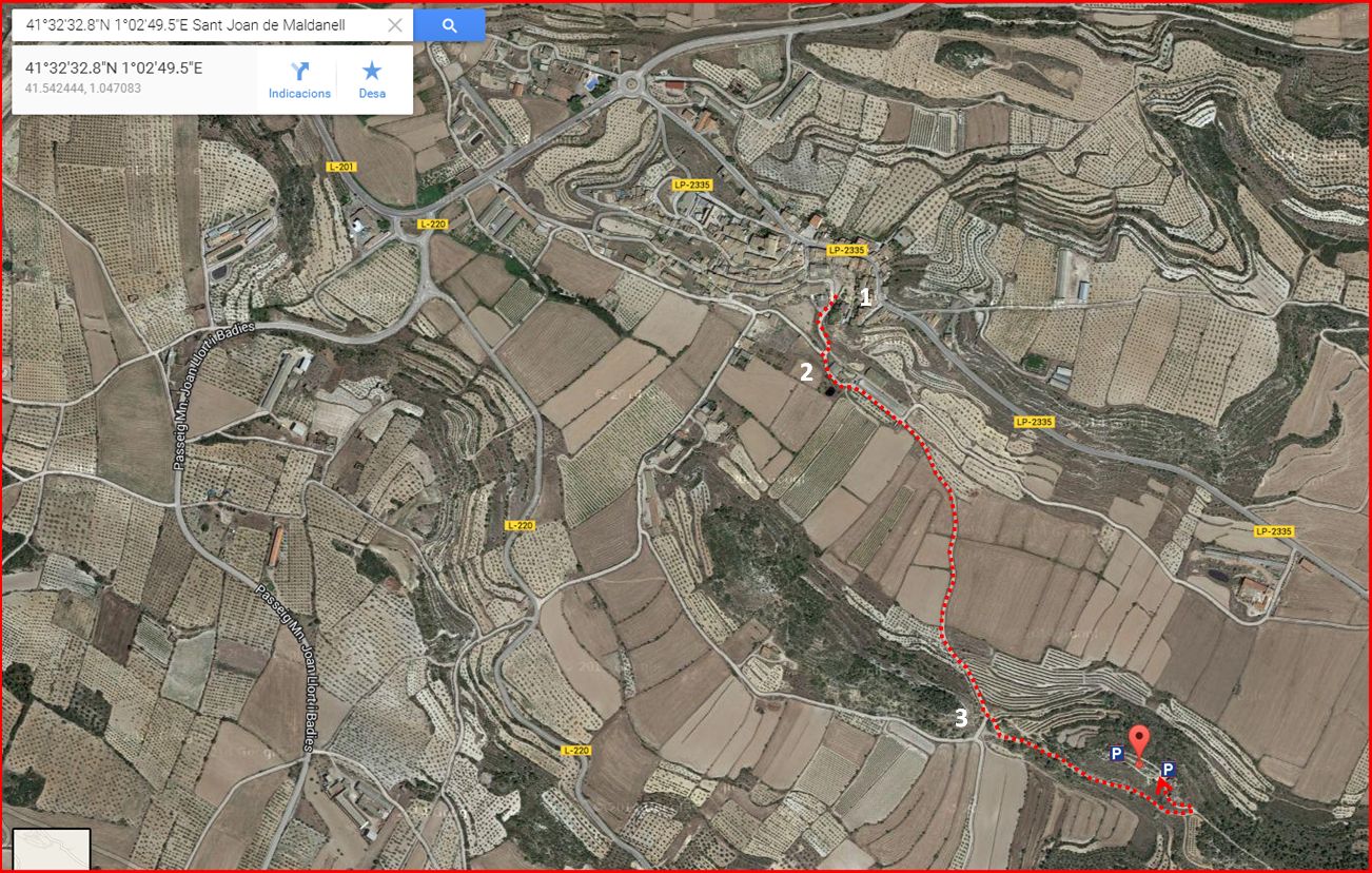 Hem sortit de la població de Maldà, des d'una ampla plaça sense asfaltar (1) que hi ha a la part del darrere de l’església de Sant Pere (N 41 32 59.2 01 02 25.7), per un camí de terra, en baixada, perfectament transitable.