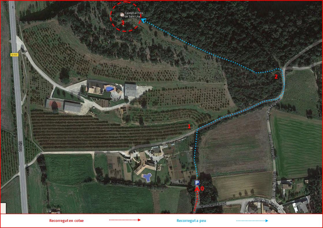 Havent estudiat l'itinerari, vàrem determinar que el punt d'inici (0) seria un lloc situat a 41 55 00.4 02 44 10.3, podent arribar fins aquí, circulant per terreny asfaltat.