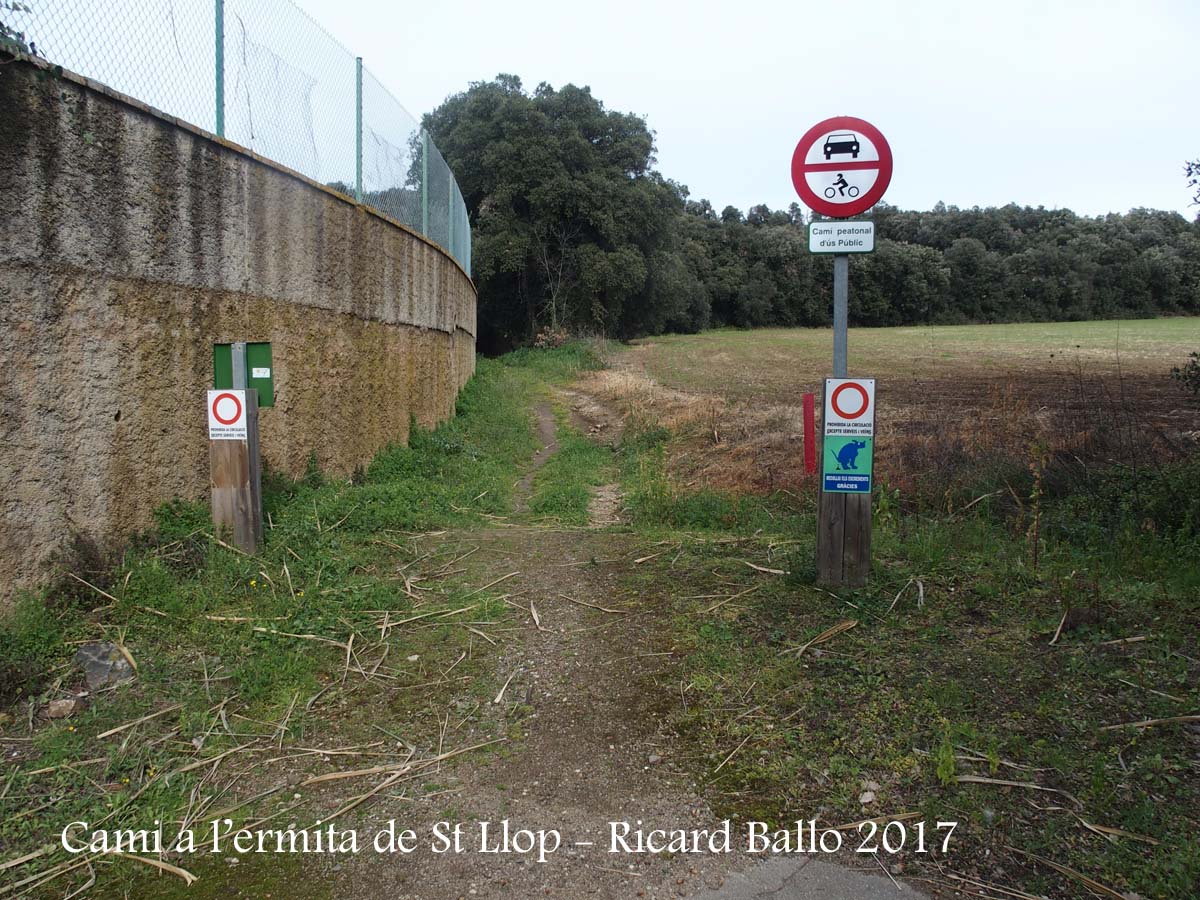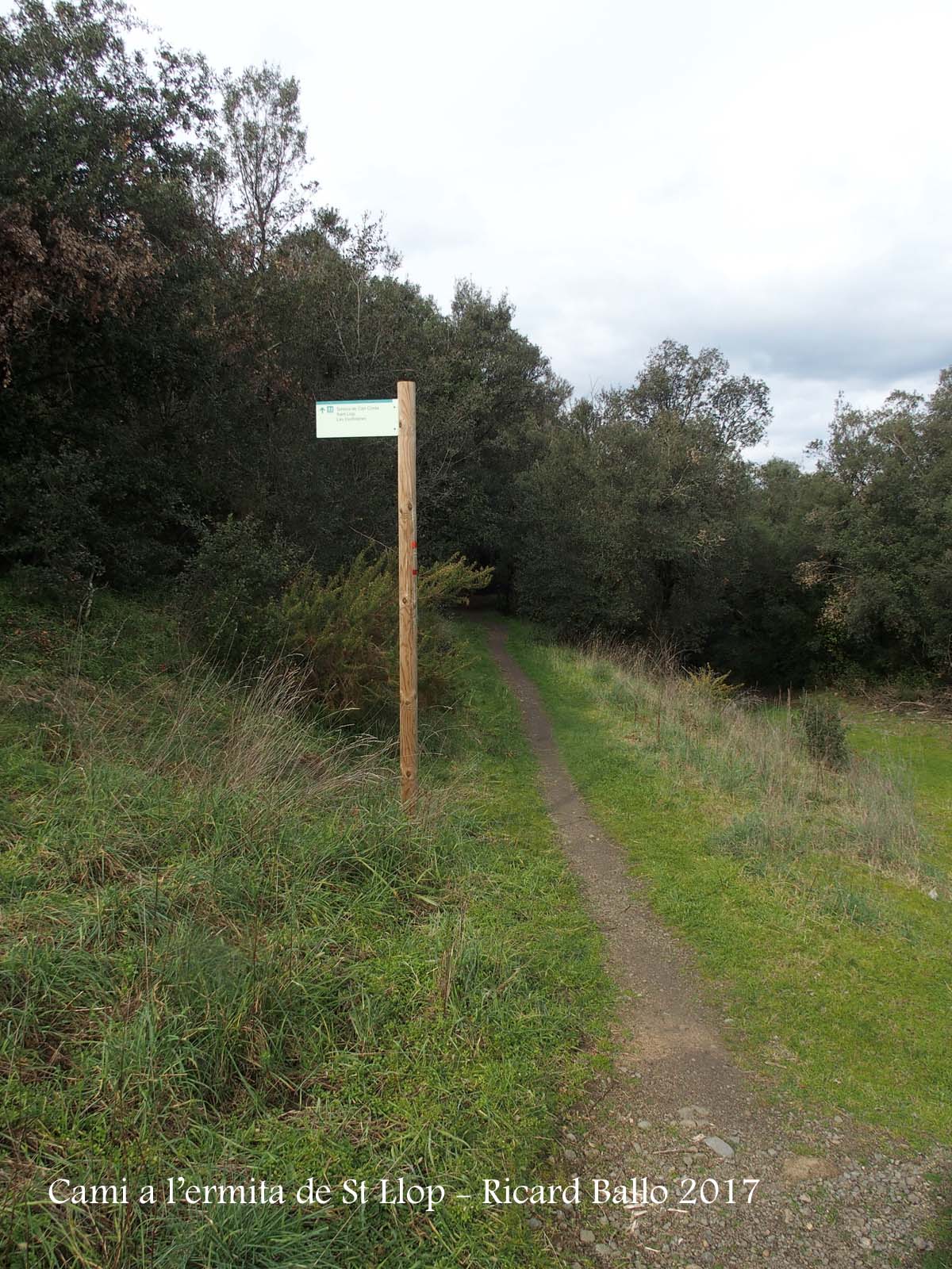 Al cap d'uns deu minuts, arribem a un lloc (2) 41 55 07.7 02 44 17.6 on hi ha un indicador per anar a Sant Llop, continuant per l'esquerra, enfilant-nos una mica i internant-nos al bosc.
