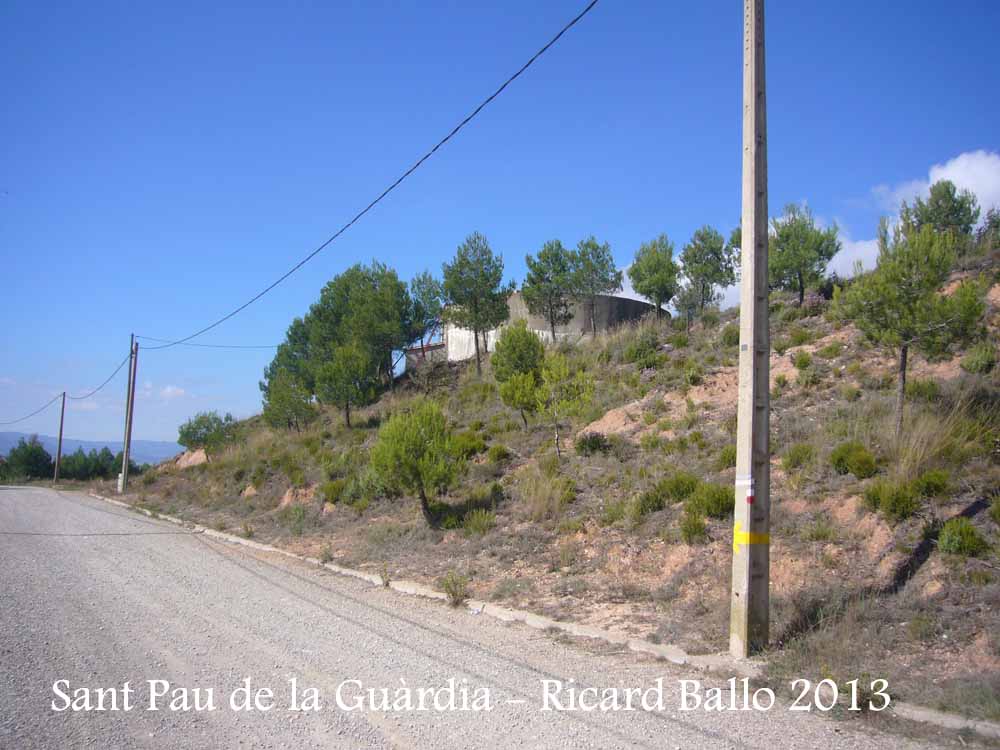 Iniciem el camí a Sant Pau de la Guàrdia. Situats (0) a la confluència dels carrers Verge de Montserrat i Manresa (N 41 36 39.91 E 01 44 37.72), deixem a l'esquerra, alçat, un dipòsit d'aigua.