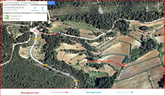 A només uns cent metres, a la dreta, veurem un petit cartell enganxat a un arbre (41 22 23.8 01 25 46.3 ) que ens indica l'inici d'un camí, en baixada, que ens ha de conduir a Santa Agnès, al cap d'uns 300 metres.