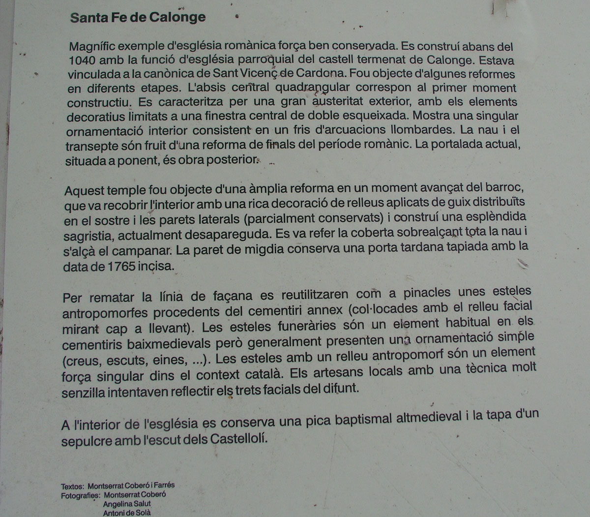 - Per complementar la informació anterior, ens complau extreure de la pàgina web de l'Ajuntament de Calonge de Segarra, el següent text (Octubre 2013):