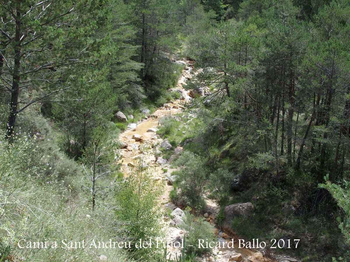 Trepitjant les pedres que algú ha disposat amb anterioritat, creuem l’aigua. A l’altre costat sols es pot anar cap a l’esquerra, cap a on continuarem uns quants metres.