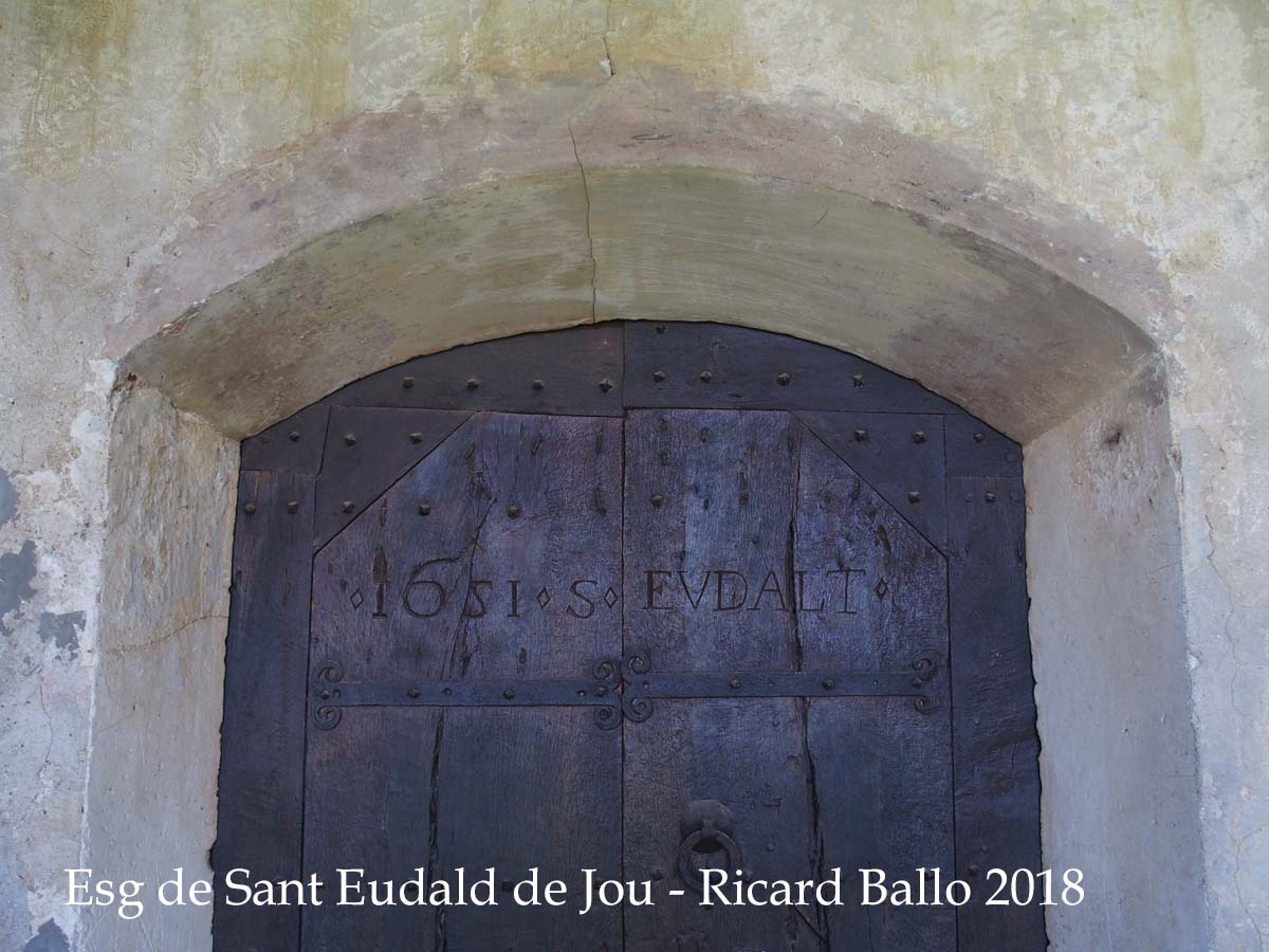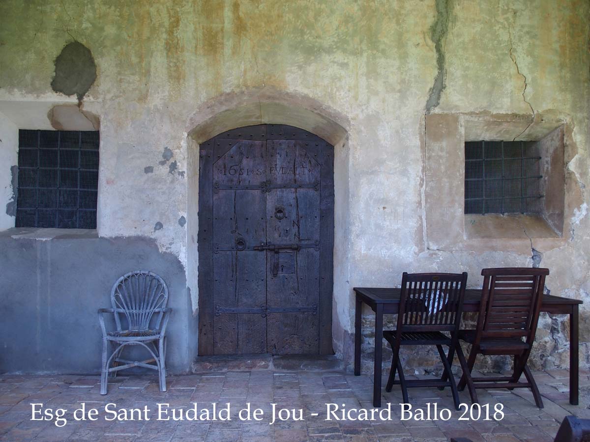 Conserva les ferramentes d'època romànica malgrat que fou substituïda per una de nova al segle XVIII. El forrellat és acabat en cap de drac i presenta diverses decoracions geomètriques que es repeteixen a la resta de les ferramentes. Als batents de fusta es gravà la següent inscripció: