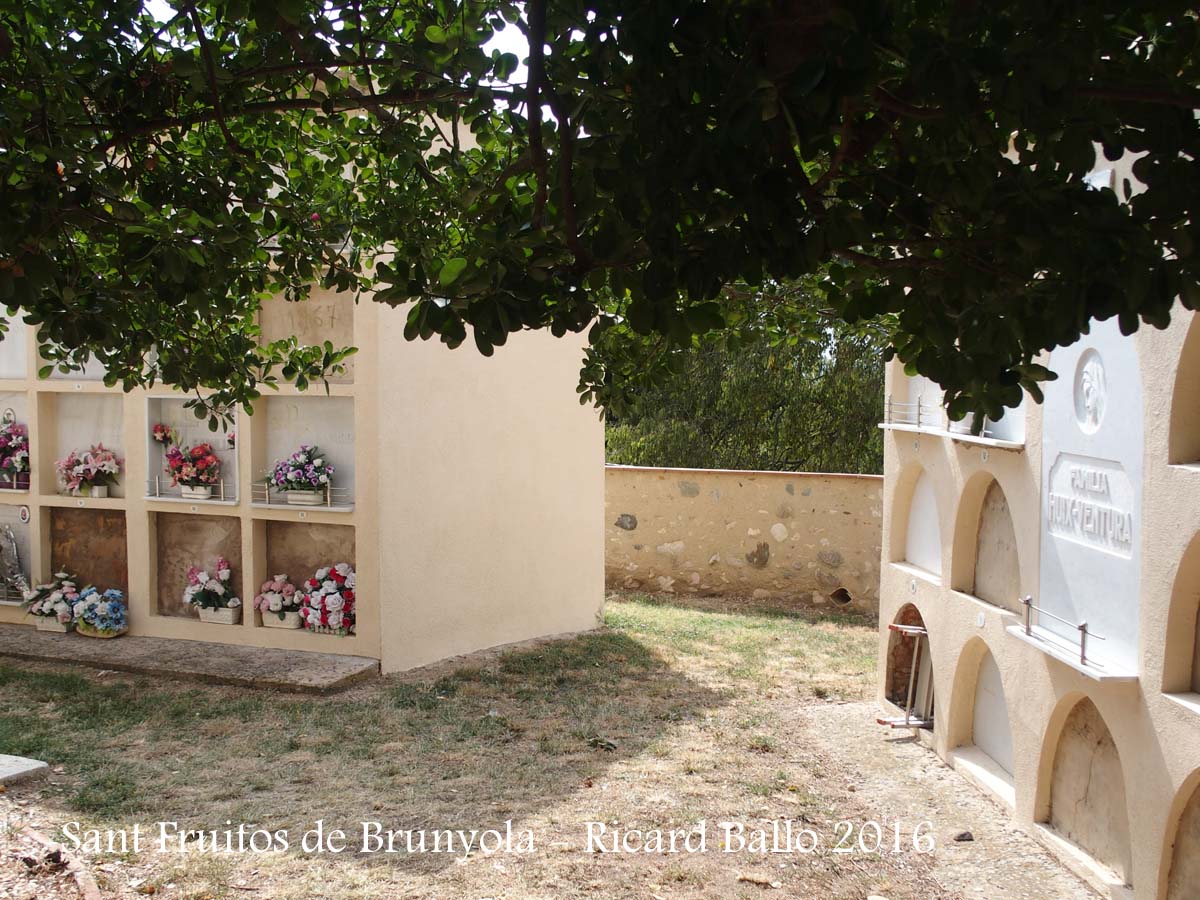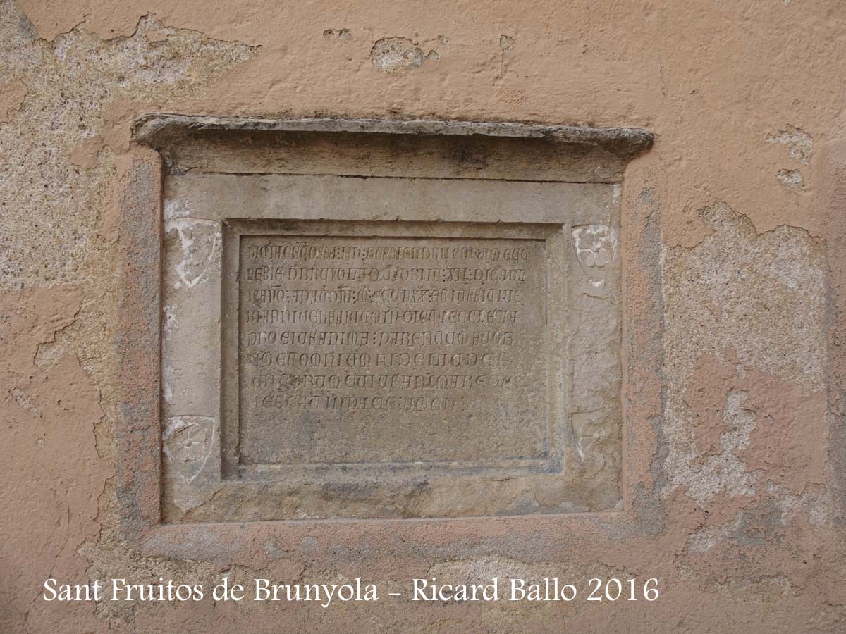 L'església parroquial de Sant Fruitós està situada al costat del castell de Brunyola (Veure fitxa del Castell de Brunyola), dintre el que fou el clos fortificat, de tal manera que una de les antigues torres d'angle del castell es va adaptar com a campanar.