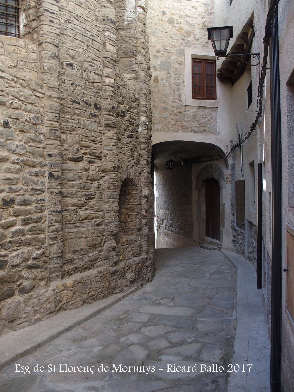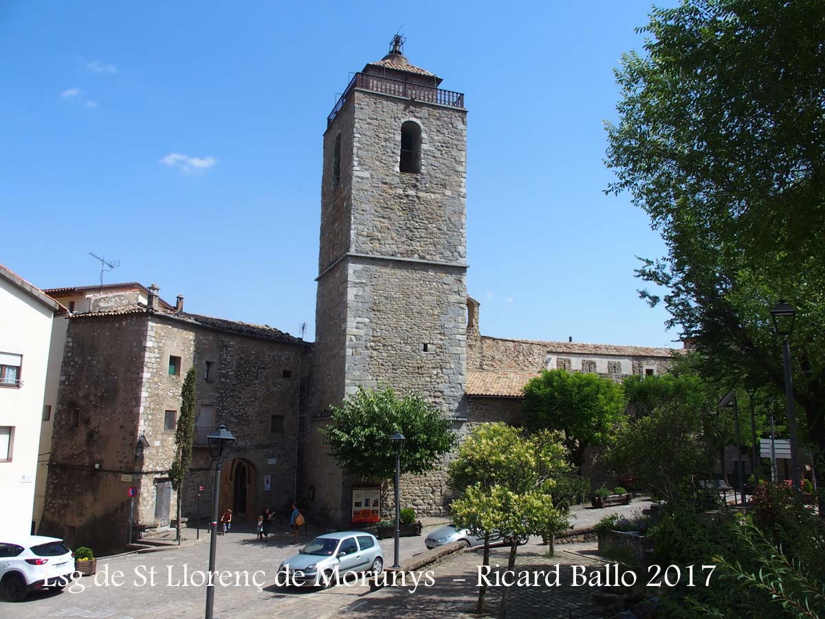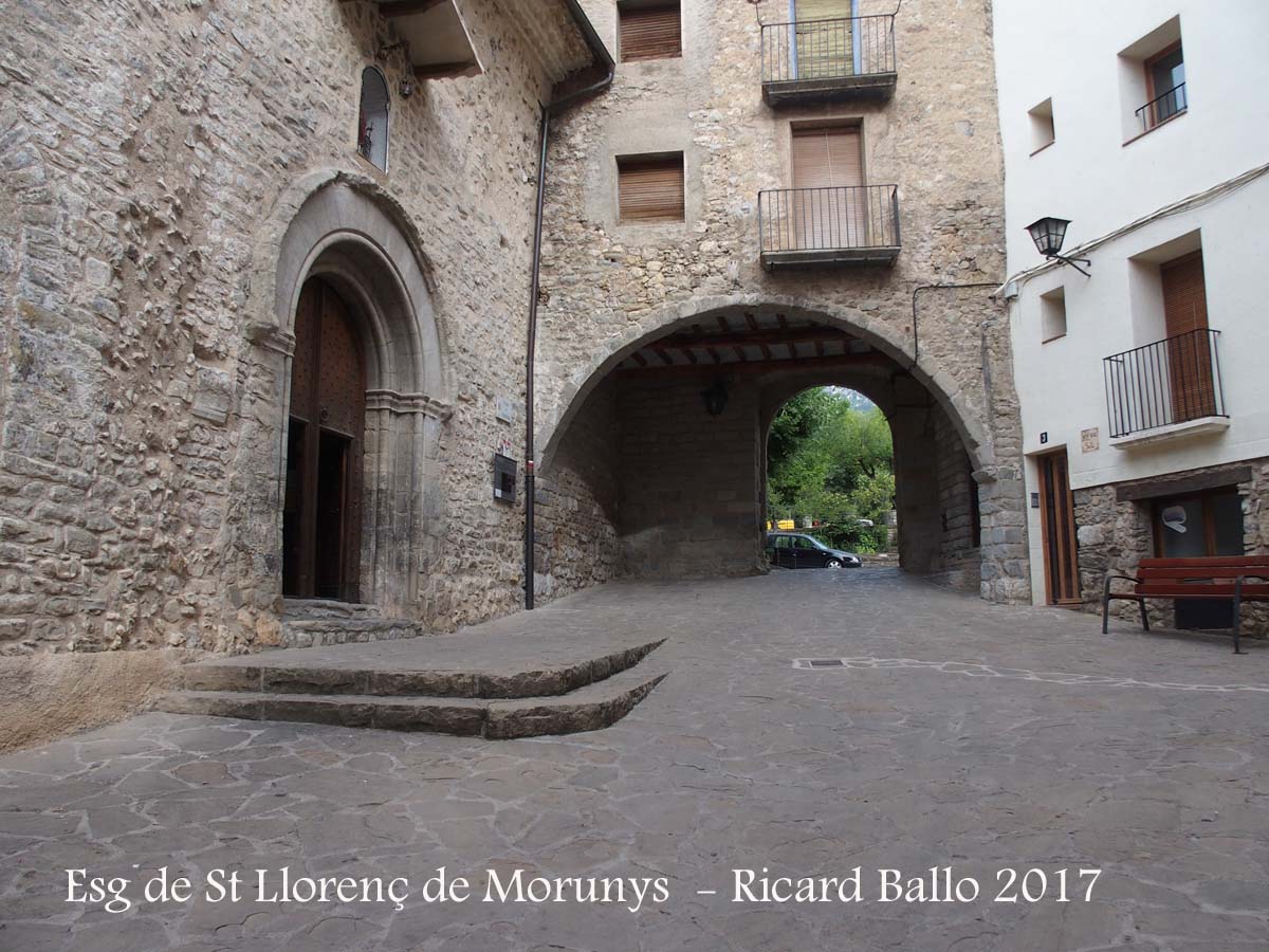 El temple de Sant Llorenç de Morunys en l'actualitat forma part de l'enteixinat d'edificacions properes al sector nord-oest del recinte emmurallat de la població de manera que els murs exteriors queden parcialment amagats.