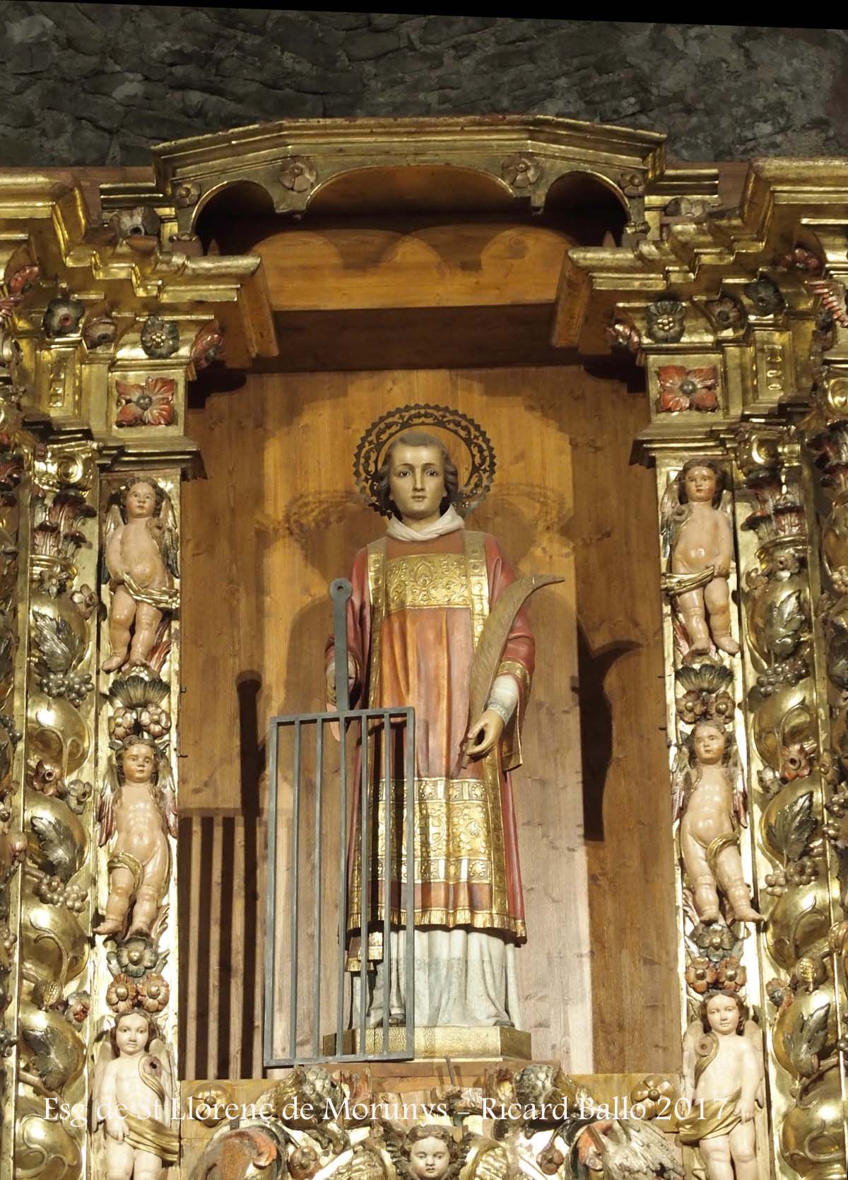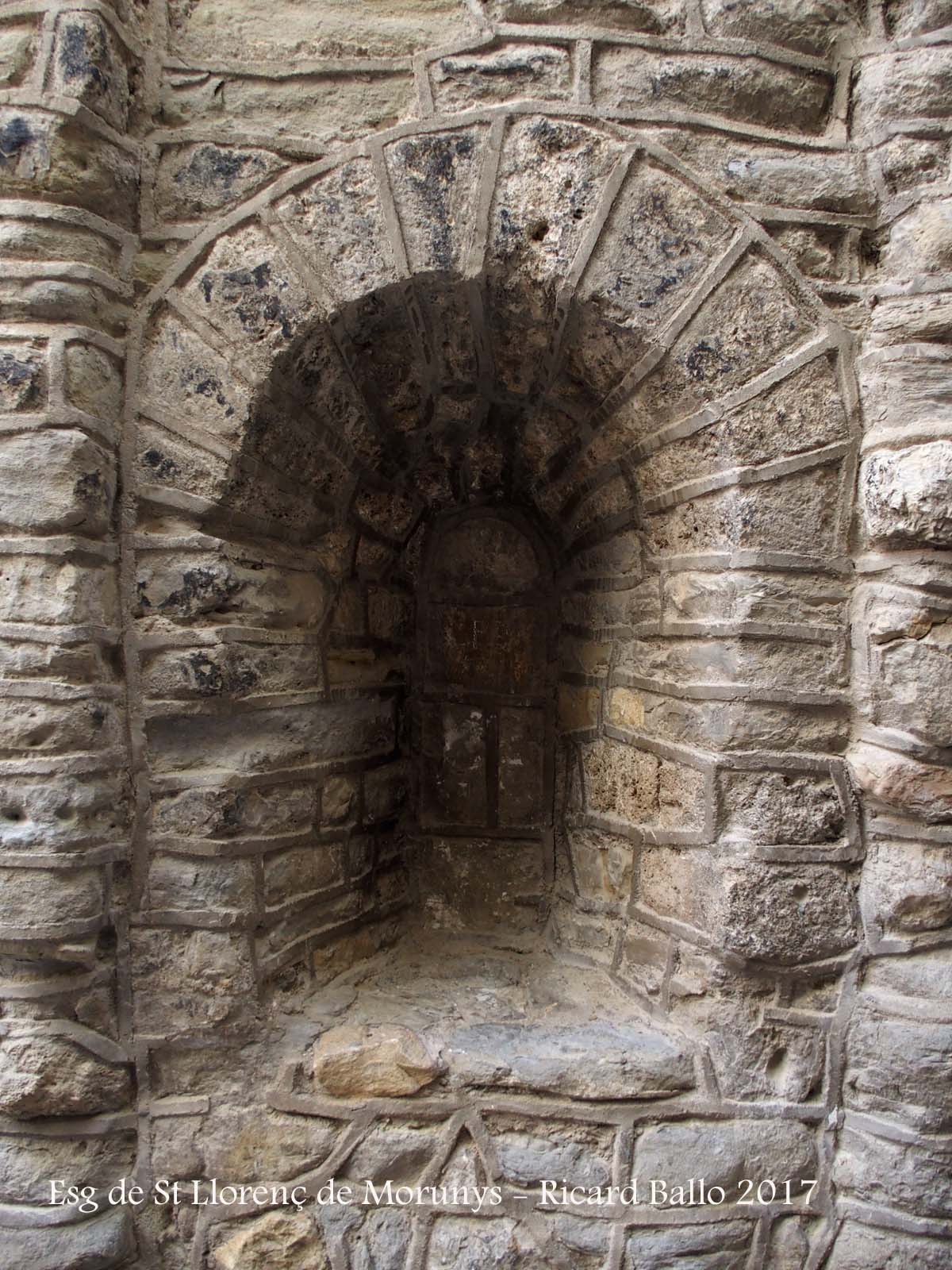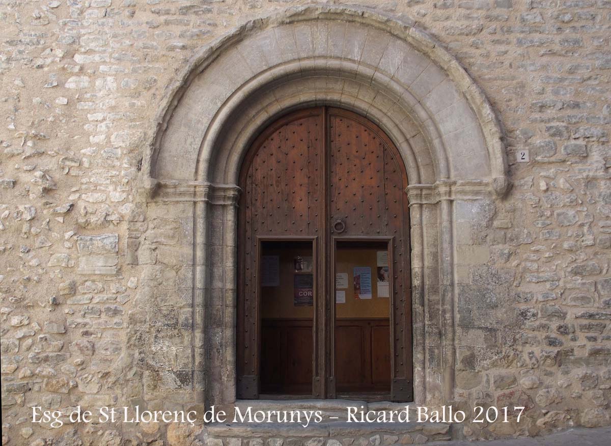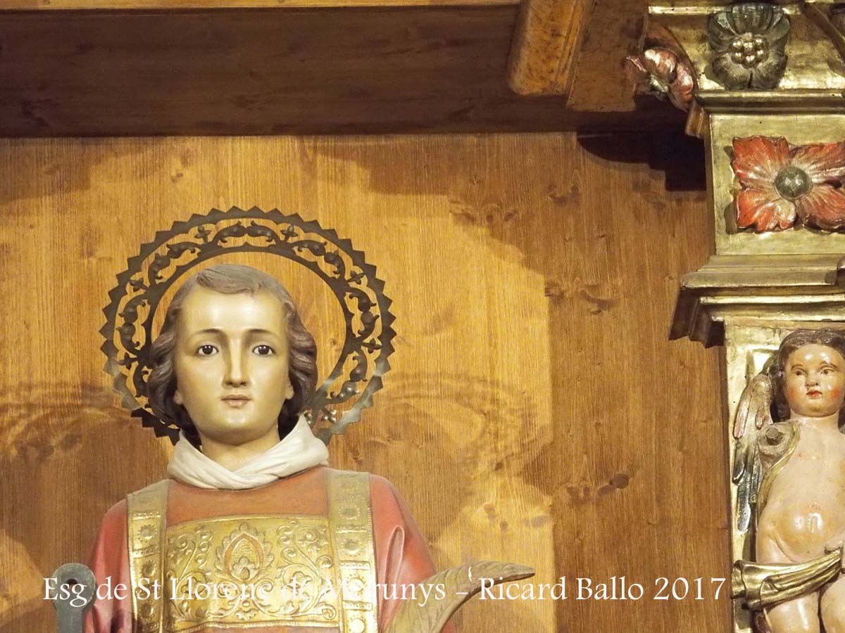 L'acompanyen, en la degradació lleugera de la porta dues arquivoltes molt fines sostingudes per fines columnes i una cornisa que ressegueix els capitells formant una imposta. Sobre la porta fou oberta posteriorment una petita fornícula on es col·locà la imatge de Sant Llorenç.
