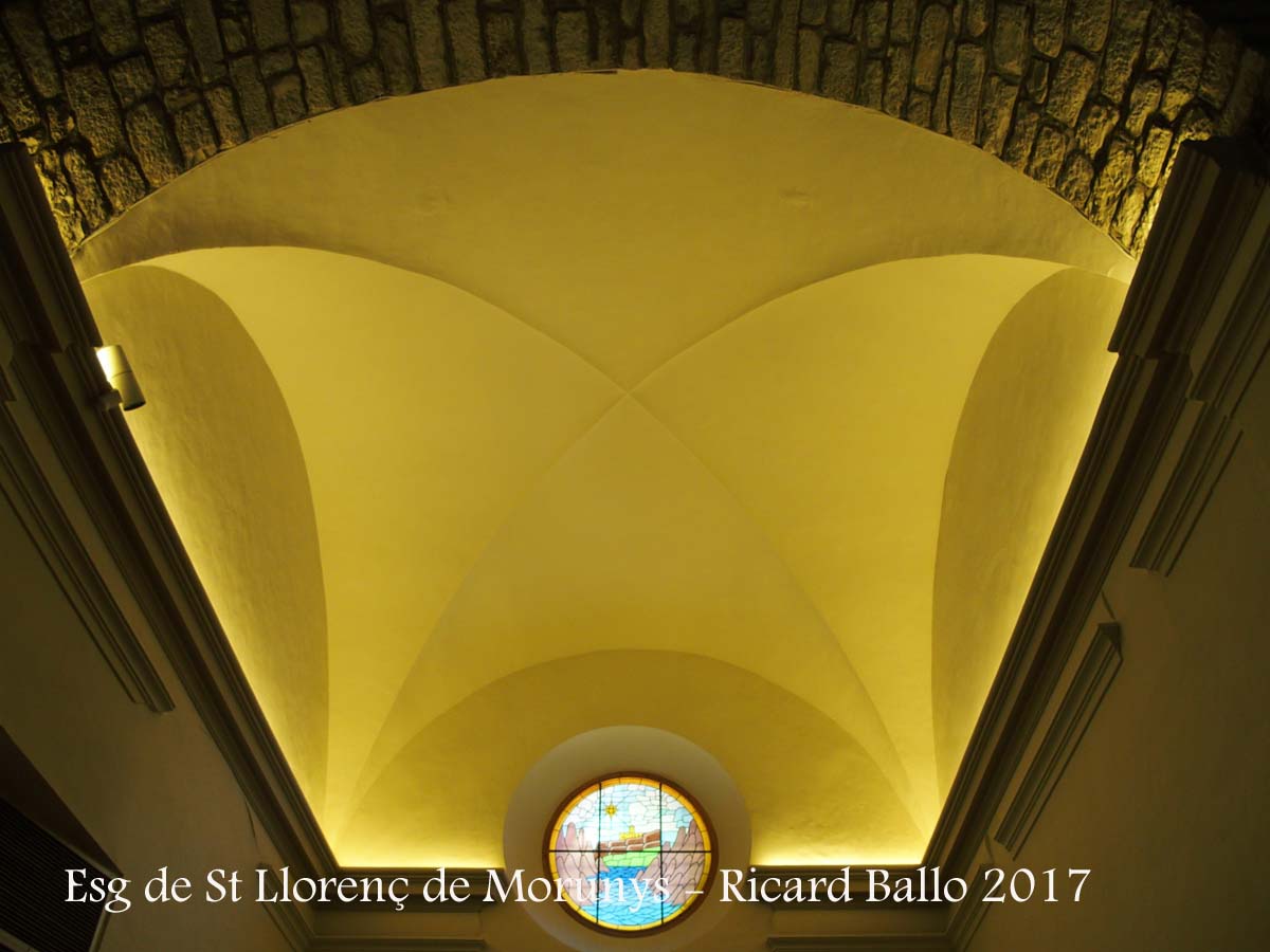 A la nau central s'aixeca un cimbori romànic, de planta octogonal sobre petxines, decorat interiorment amb pintures barroques.
