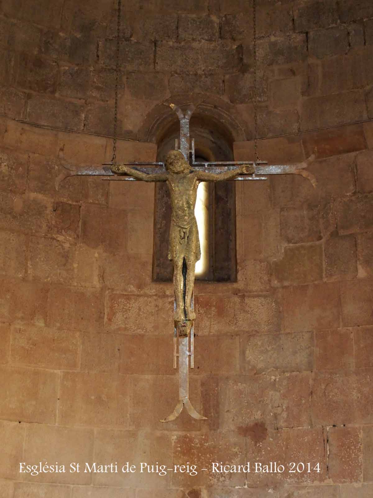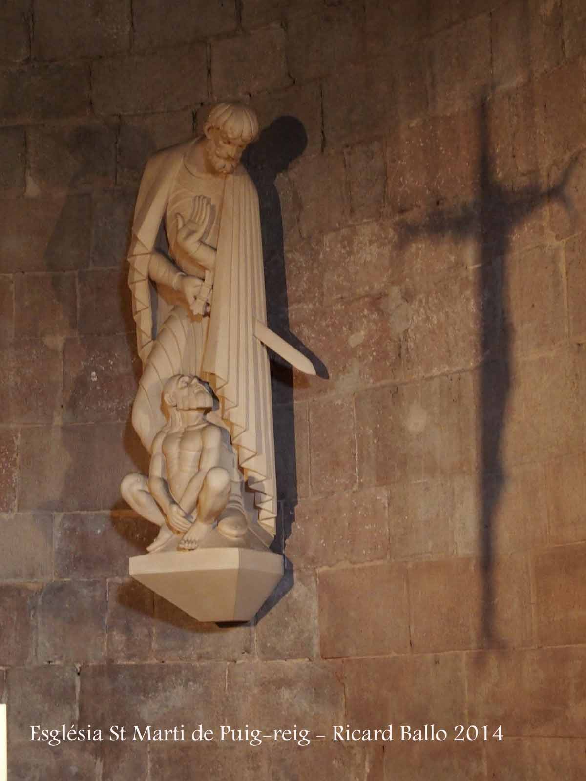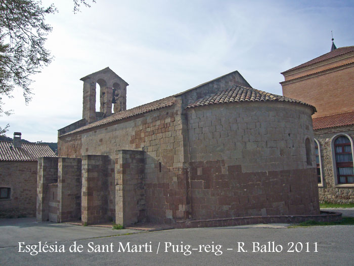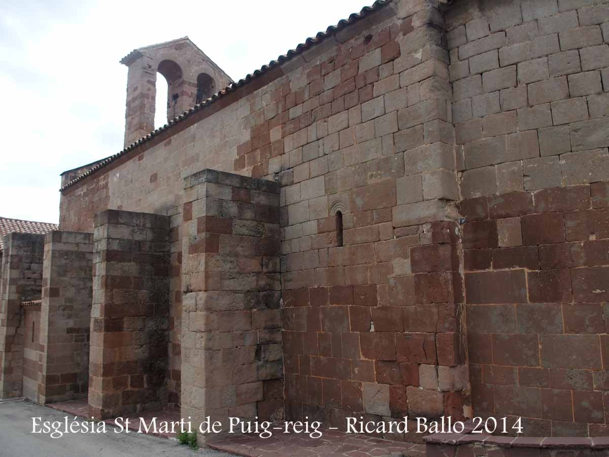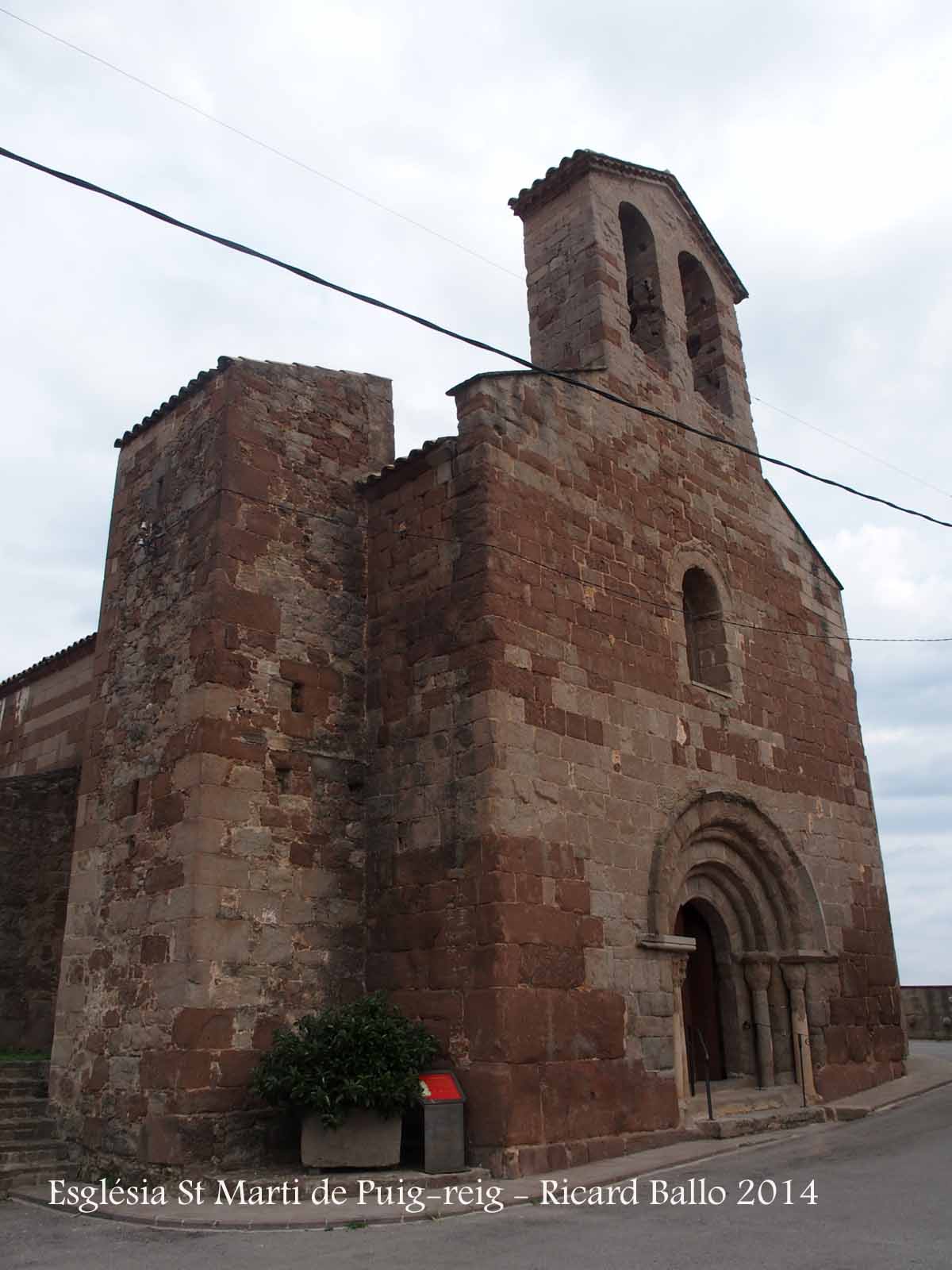 Portal. És una de les parts més interessants de l'església romànica de Sant Martí de Puig-reig. Situada al mur de ponent és una peça simple però força elegant. Consta d'un conjunt de tres arcs de mig punt dovellats i en degradació, coronats per una senzilla arquivolta escarada que descansa sobre una imposta simple, a manera de motllura. Sota la imposta hi ha dos grups de capitells, a banda i banda, que sostenen columnes de fust relativament curt. Els capitells presenten temes molt elementals i molt esmolats, tres dels quals han perdut gairebé tota la seva decoració. En línies generals tots els capitells tenen una decoració geomètrica: dos pisos superposats de losanges. Per damunt de les impostes surt un nervi que ressegueix el semicercle de l'arcada.
