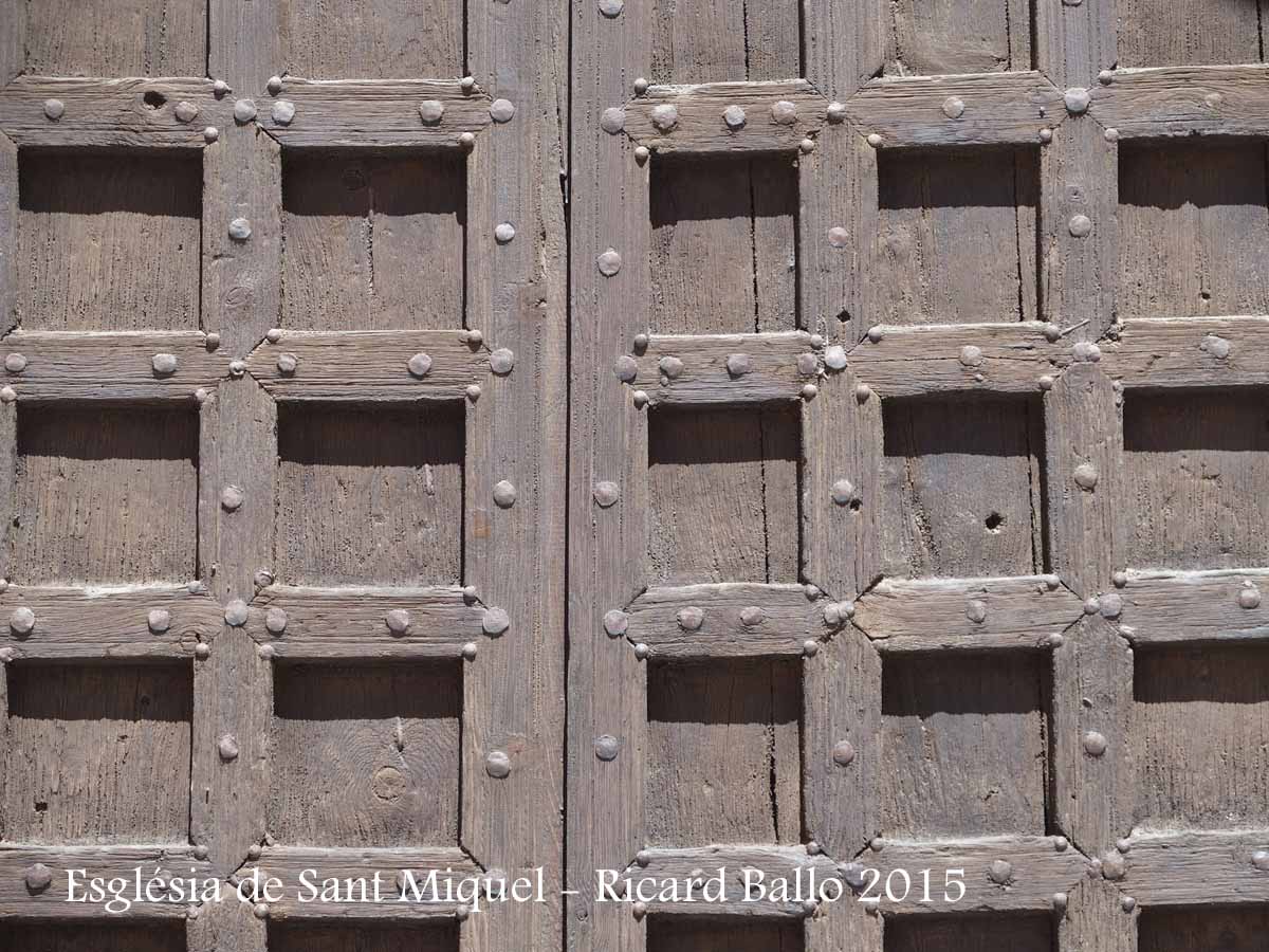 Porta de dues fulles i dos petits segments practicables. Sobre una base de fusta llisa, la porta s'articula mitjançant cassetons regulars clavats amb claus de forja de testa semicircular. El fonellat es de forja, presenta un elements cisellats de formes geomètriques. Aquest tipus de porta, de tradició tardo-gòtica, ha desaparegut quasi totalment.