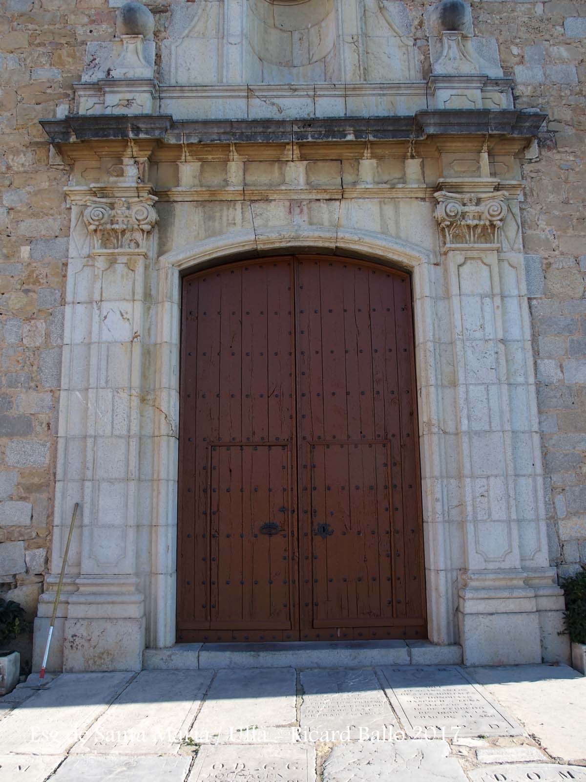 En el frontis hi ha la portada d'arc rebaixat, pilastres i capitells jònics simulats, entaulament amb motllures i pinacles amb semiesferes i al centre una gran fornícula -ara sense imatge- sobre la qual hi ha gravat l'any 1792.