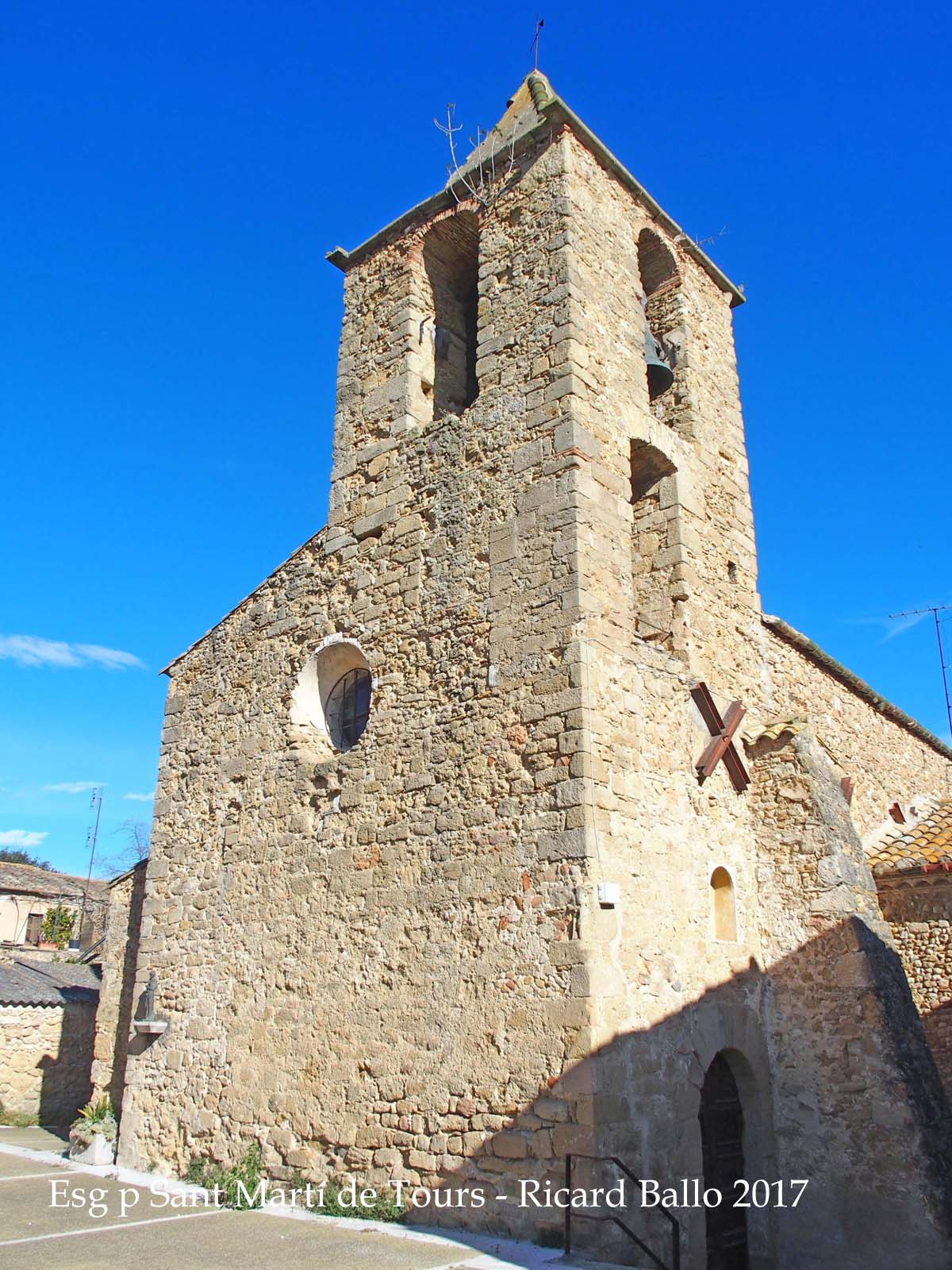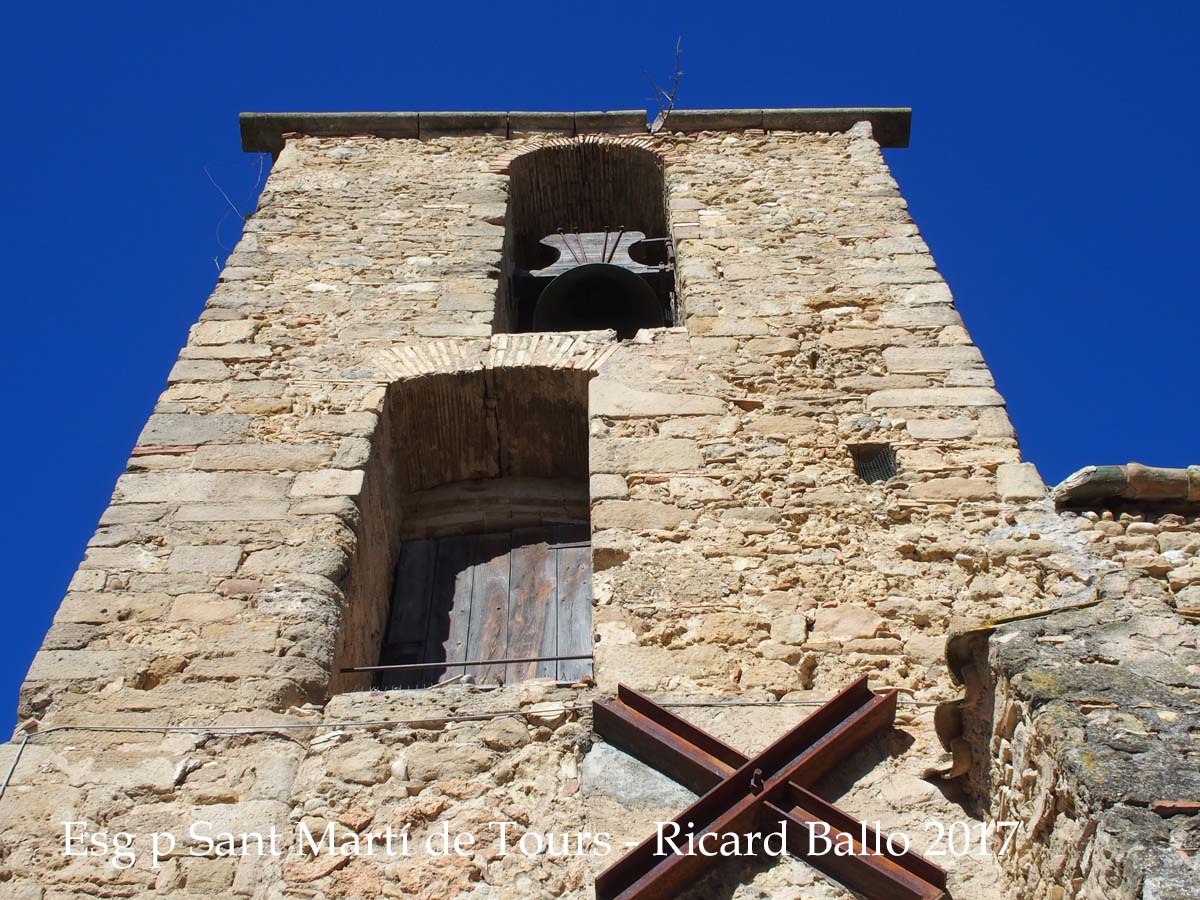 Sobre l'entrada hi ha la torre campanar, de planta quadrada, obertures d'arc de mig punt a la part superior i coberta piramidal.