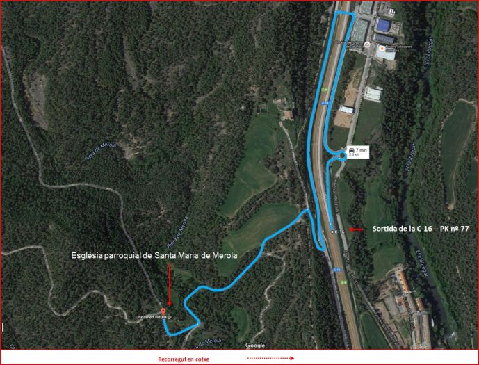 Travessem una rotonda que abandonem per la tercera sortida (Can Vidal) i ens trobem circulant per una carretera de doble sentit, paral·lela i a un nivell inferior a la C-16, fins arribar a una cruïlla (41 56 21.12 01 52 39.14) on ja hi ha un cartell indicatiu per anar a Santa Maria de Merola, invitant-nos a girar a l'esquerra, passant mitjançant un petit túnel, per sota de la C-16.