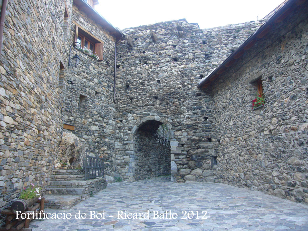 De l'antic recinte emmurallat de Boi me resten visibles el portal que donava a l'antic camí de Caldes (actualment sobre la plaça de l'Església), la torre de l'angle Nord-Est, part de la torre Est i indicis de la cantonada Sud-Est, trams del pany de muralla entre elles i un tram en forma de L, separat de la resta, entre els dos turons sobre els que, en part, es recolza la població.