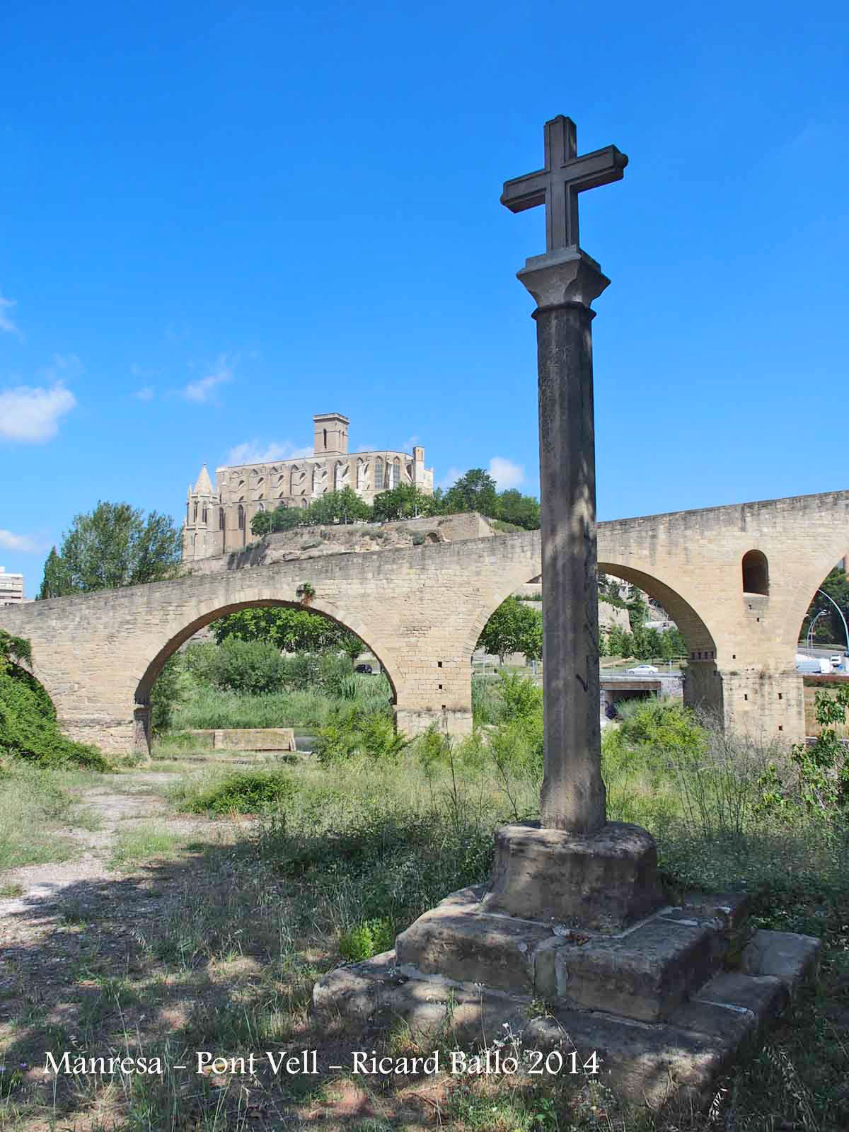 " El Pont Vell travessa el riu Cardener a l'entrada sud-oest de Manresa. El pont ha sofert diverses destruccions. D'origen romà, l'actual es tracta de la reconstrucció fidel d'un pont medieval també reconstruït el segle XII, del qual només es conserven les bases de l'arc central. El pont, que va ser destruït el 1939 i refet entre els anys 1960 i 1962, dibuixa vuit arcs de mig punt amb una alçada màxima de 25 m sobre el cabal del riu.