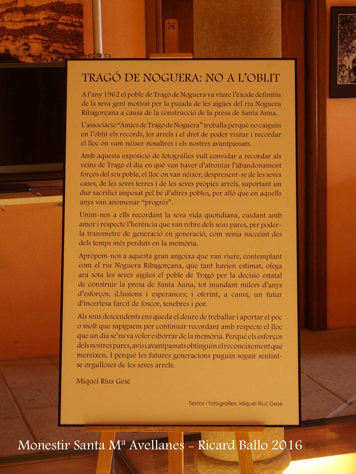 - El dia de la nostra visita vàrem trobar una exposició de fotografies: “ A l’any 1962 el poble de Tragó de Noguera va viure l'èxode definitiu de la seva gent motivat per la pujada de les aigües del riu Noguera Ribagorçana a causa de la construcció de la presa de Santa Anna.