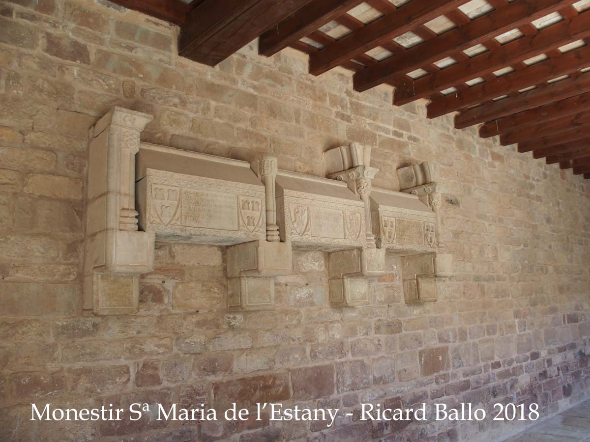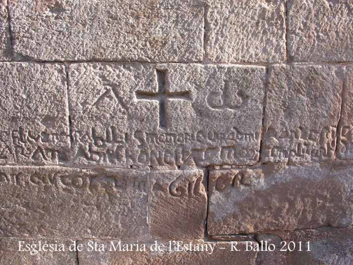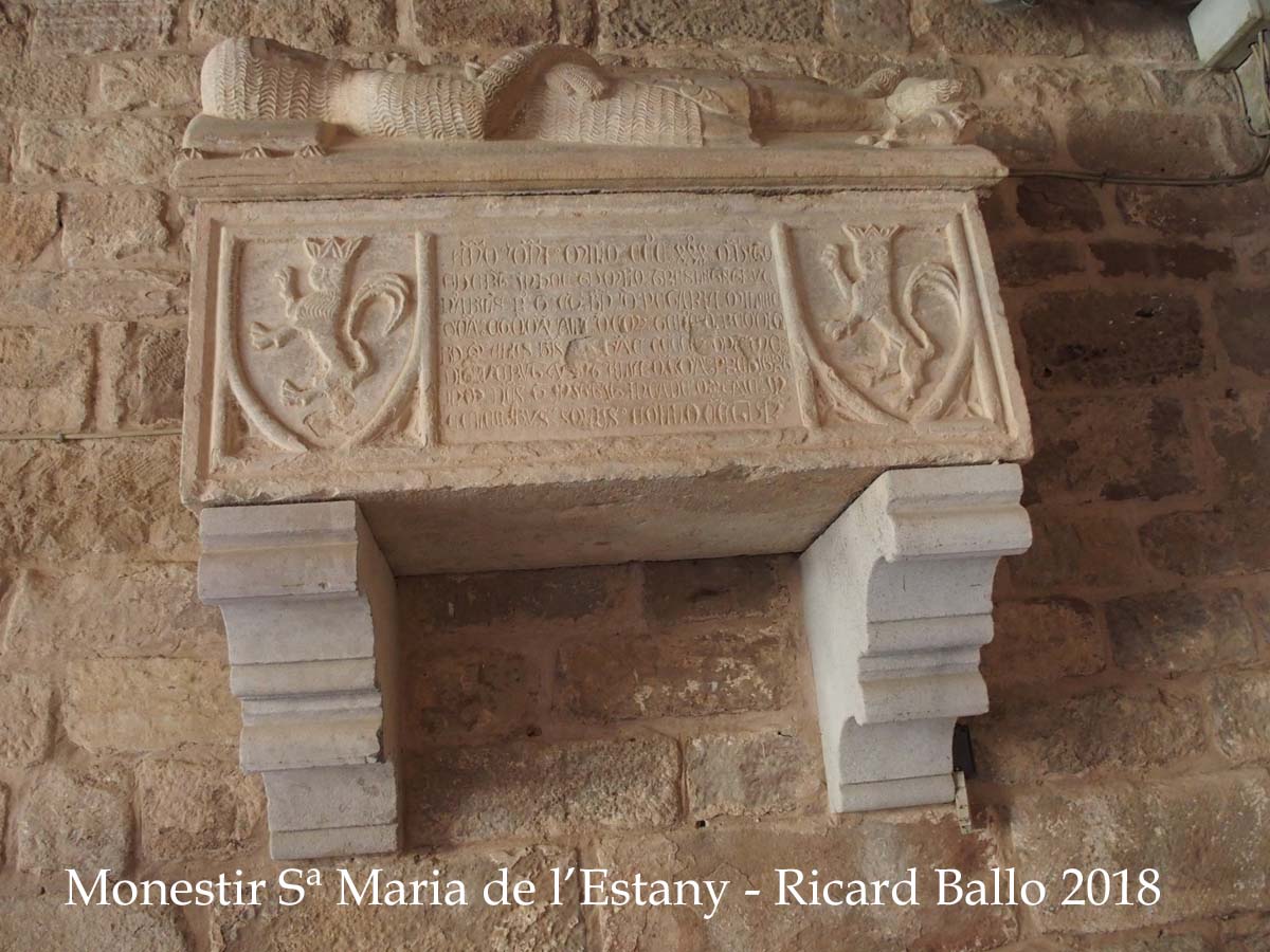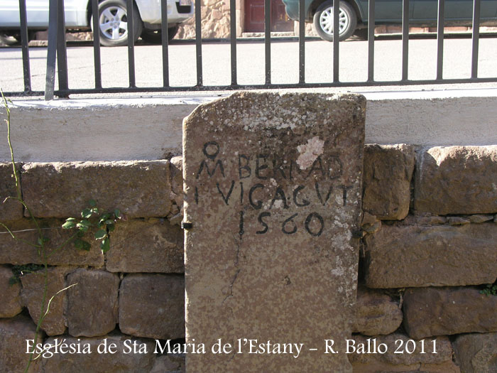 Presenta la següent inscripció: al dia set de les Kalendes de Novembre (26 d'octubre) de l'any 1311 morí en Jaume, per la Gràcia de déu, abat de l'Estany, qui enriquí aquesta església amb molts béns espirituals i materials, l'ànima del qual pugui fruir dels celestials".