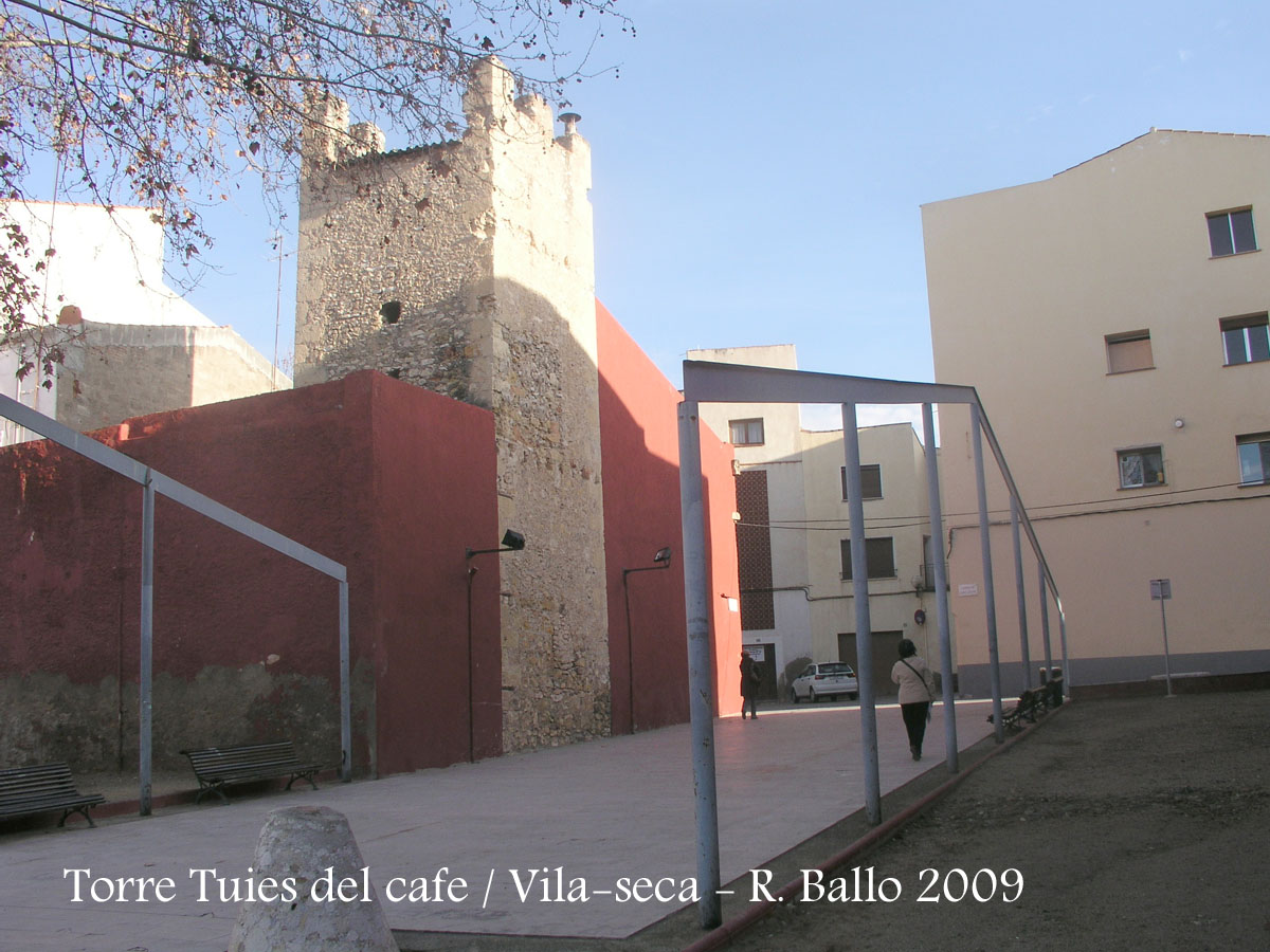 La torre de les Tuies del Cafè es troba en el tram del costat occidental de la muralla, que ha quedat fossilitzat en el traçat del carrer de la Riera. La torre ha quedat inclosa dins habitatges, però l'obertura del carrer de l'Abat Anselm Clavé va permetre visualitzar en tota la seva alçada la façana meridional.