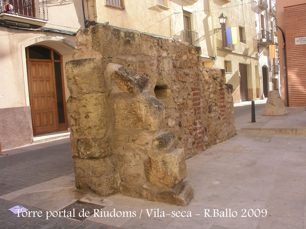 La torre del portal de Riudoms havia estat començada cap a l'any 1504. A partir de 1675 les torres van ser venudes a particulars i es va iniciar la seva progressiva degradació.”