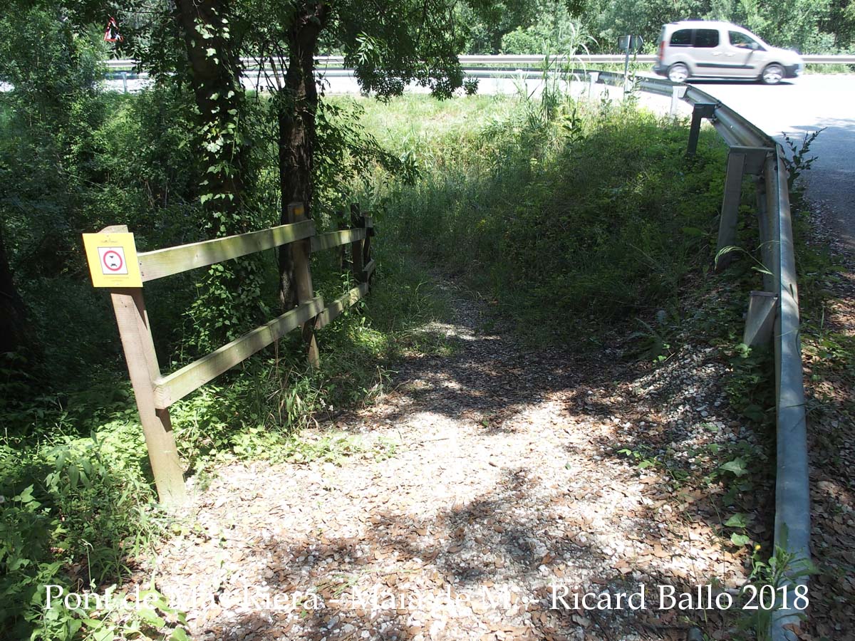 En aquest lloc hi ha el començament d’un discret camí, en baixada, delimitat per una banda per la barra protectora de la carretera i per l’altra, per una barana de fusta.