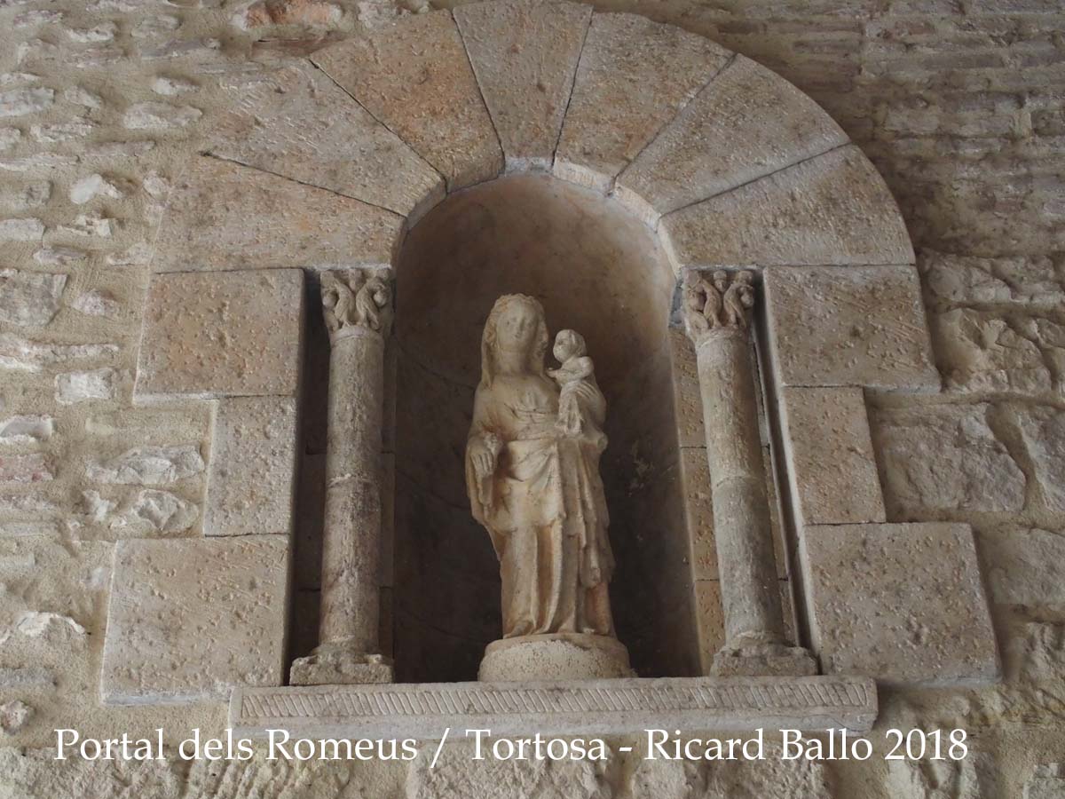 Al mig de les dues s'inscriu un plafó de rajola vidriada amb una part del Camí de Santiago i a sobre la inscripció: "portal del Romeu/ sobre el Vall/ via romana/ Tarraco-Tortosa/ Ruta Santiago/ Restaura: Valls pintor 1385/ Restaura: Capera 171756/ Restaura: Corp. Municipal 1909/ Restaura: Corp Municipal 1963".
