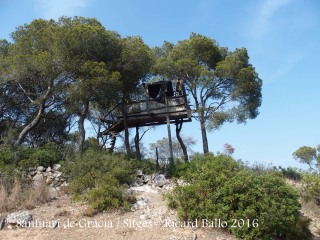 Quan arribem a dalt, continuem per l'esquerra, per un ample camí de terra. Deixarem enrere, a la dreta la “cabana d’en Tarzàn”
