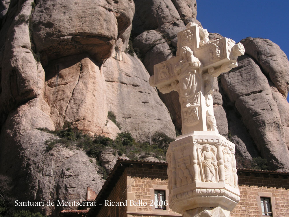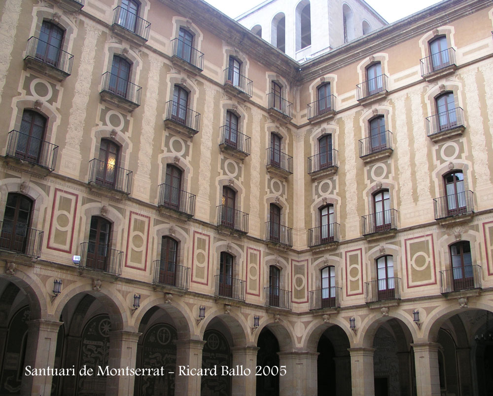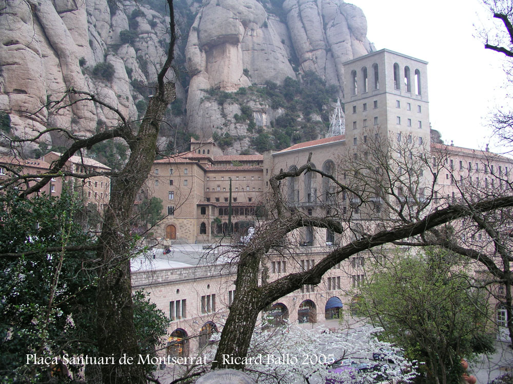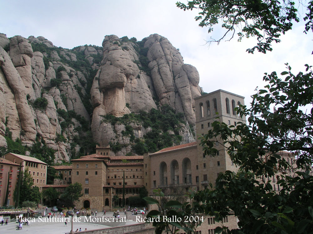 La façana del monestir de Montserrat dona a la plaça de Santa Maria, centre de tot el conjunt de Montserrat a l'entorn de la qual es distribueixen els principals edificis (monestir, biblioteca, claustre gòtic, museu, dependències dels pelegrins,...).