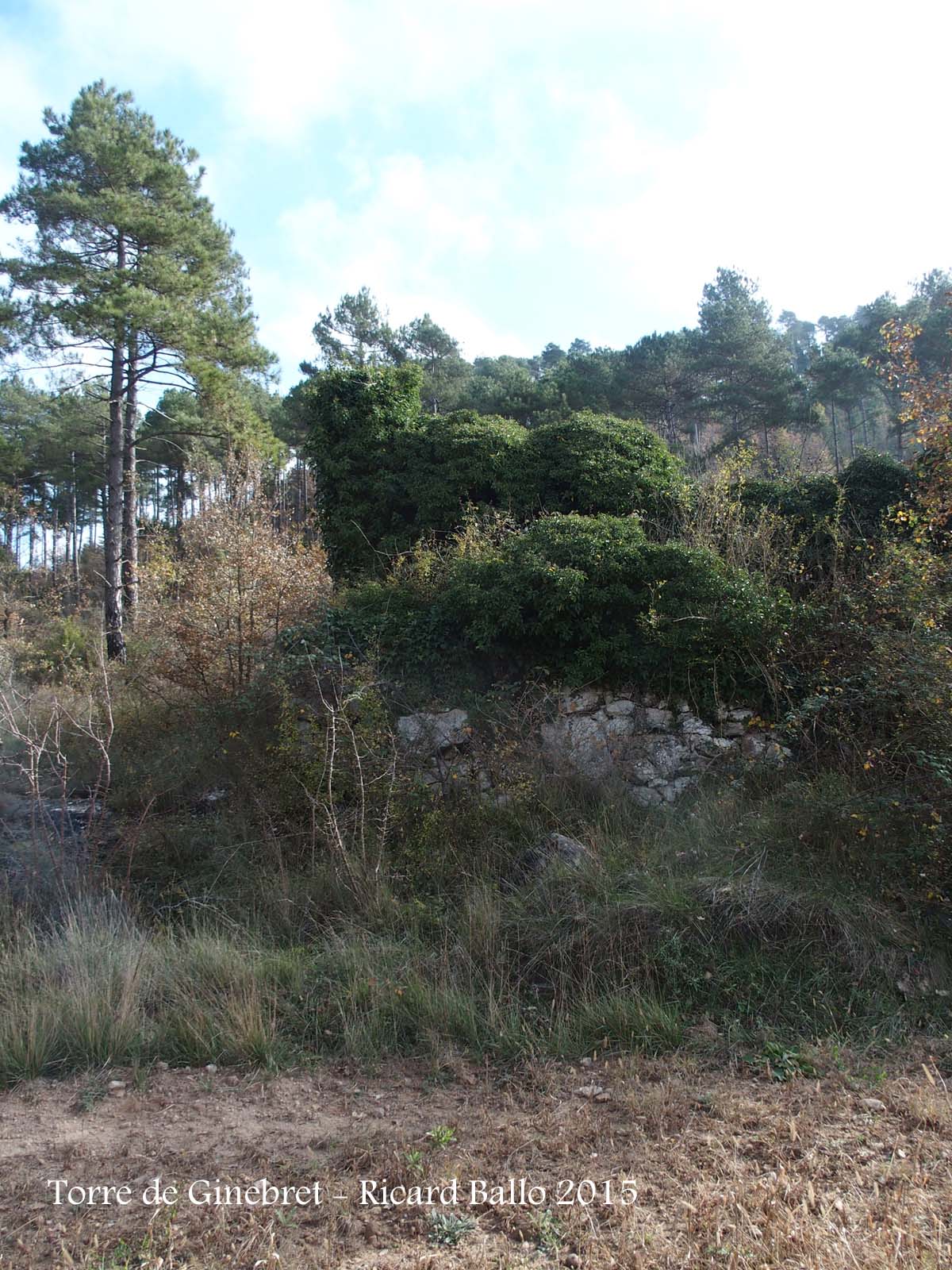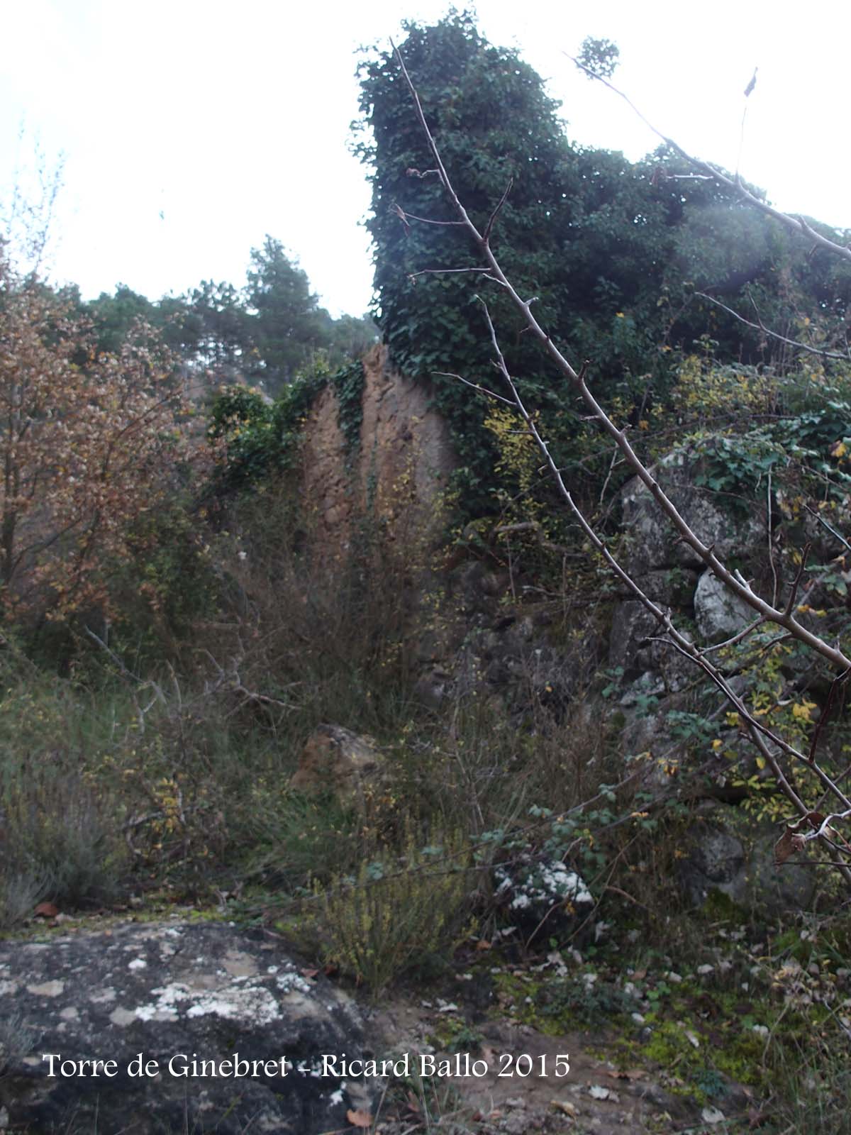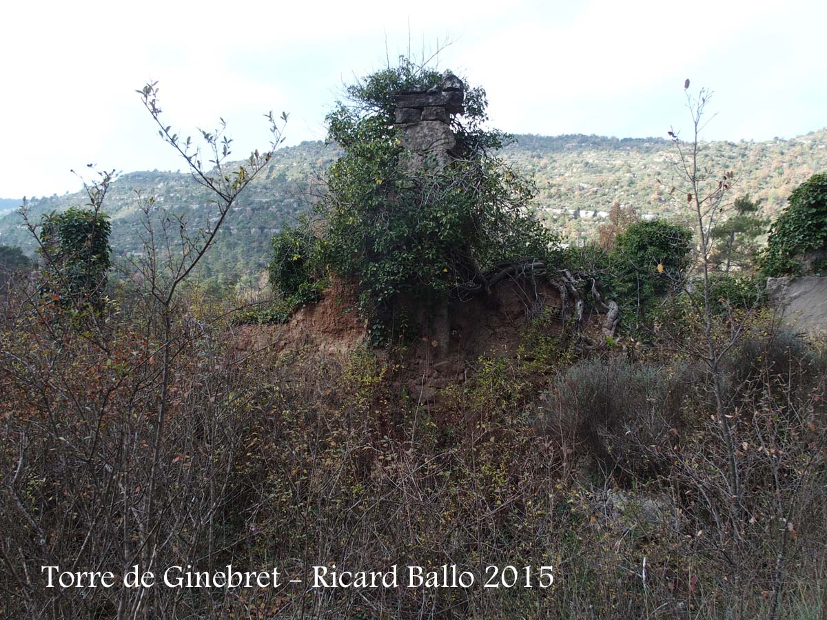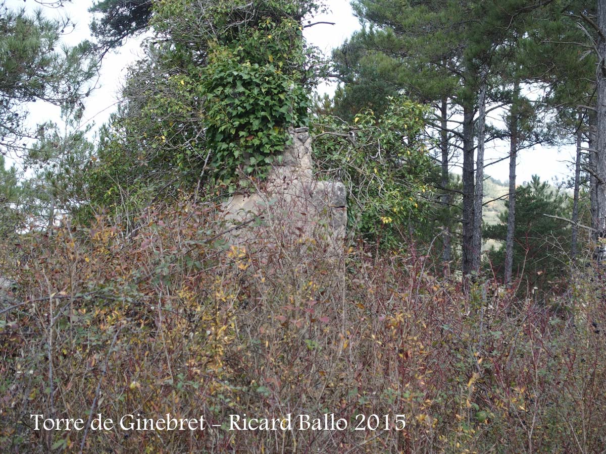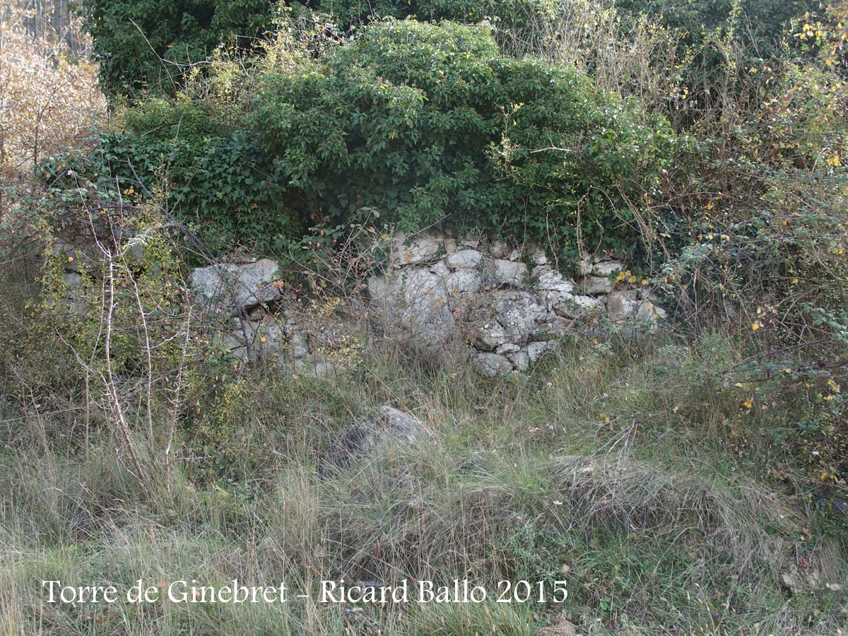 Restes de grans murs sobre Santa Maria de Pinós o del mas del Ginebret. Només es conserva l'angle nord-occidental i una part de l'angle sud-occidental.