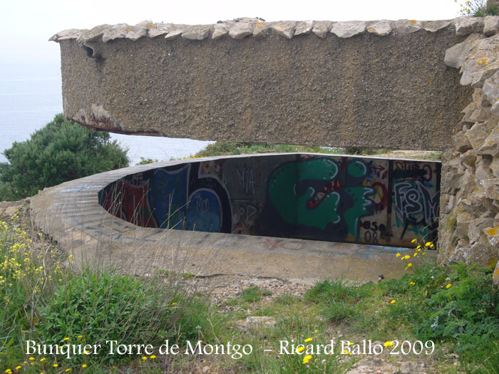 - Uns metres més endavant, per sota de la torre, podem veure unes petites i pronunciades escales que permeten l'accés a un búnquer. La porta d'entrada ha estat rebentada i s’hi pot accedir perfectament. La primera estança que trobem és una sala gran, il·luminada amb llum natural. A més, si porteu una llanterna, podeu fer una interessant visita a la resta de l’edificació. La foscor en aquesta zona és total. Hi ha varies cambres i un llarg passadís que finalitza en una porta de sortida bloquejada. Quasi totes les parets estan degudament grafitejades. Hi ha moltes deixalles per terra.